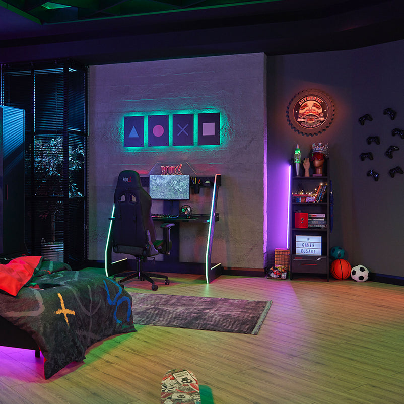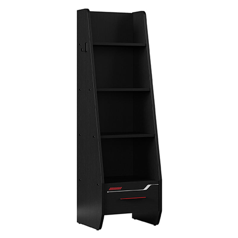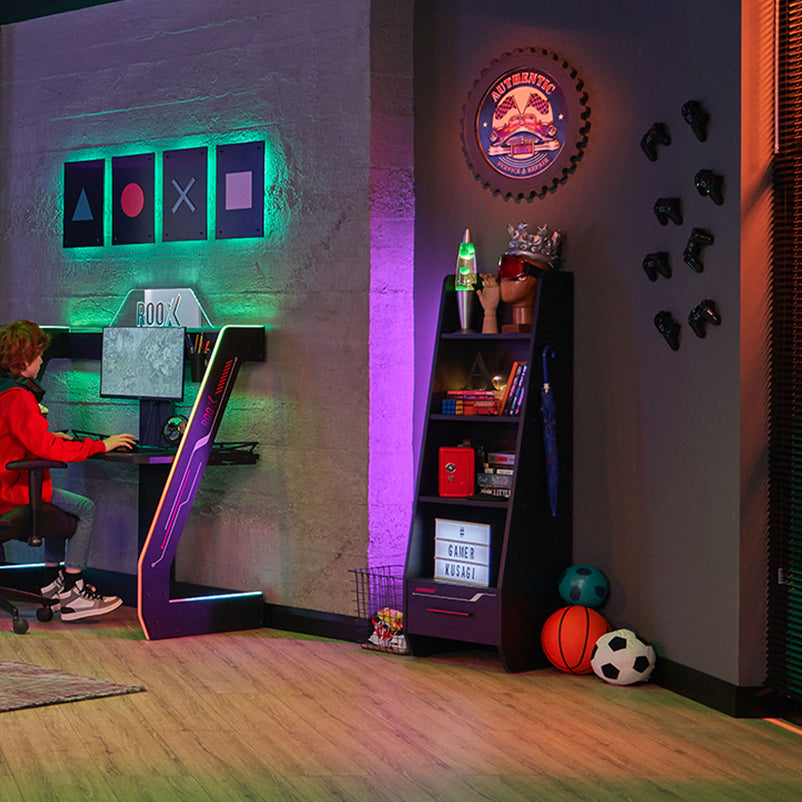 Etajeră copii, 1 sertar Be Cool. Completați zona de studiu, organizând judicios rechizitele copiilor. Un refugiu magic pentru copiii voștri, această cameră ce oferă multe module funcționale și culori uimitoare, este destinată băieților dinamici, plini de energie. Be Cool este o cameră care stimulează imaginația și gândirea neconvențională a copiilor, îi motivează atât să învețe, cât și să se joace. Mobilierul este realizat din PAL melaminat finisat cu cant rezistent ABS, având o structură stabilă și design imprimat UV. Mânerele din plastic de culoare roșie electrizantă și luminile tip LED cu lumină reglabilă RGB de pe conturul patului și biroului, subliniază personalitatea dinamică a copilului. Cele 5 module disponibile acoperă toate funcțiunile necesare într-o cameră de copil: zona de studiu, reprezentată prin etajeră și birou cu panou suprainaltat, zona de depozitare și somn, reprezentată prin dulapul cu 3 uși, patul 120 și noptiera. Benzile cu LED-uri sunt inserate la tablia patului și pe conturul biroului, fiind incluse în preț. Atractivă și funcțională, camera Be Cool acomodează copii energici și cu stima de sine ridicată, performanți atât la lecții, cât și la jocurile pe calculator.