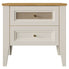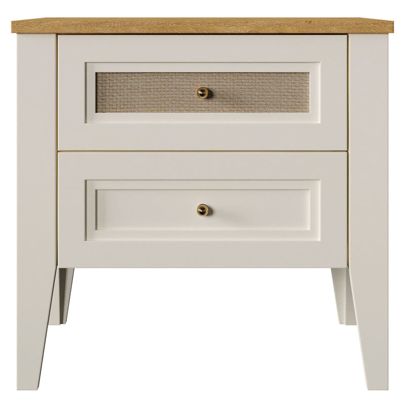 Noptieră copii, 2 sertare Corven. Realizată din PAL melaminat de grosimi 18 și 25 mm și profile din MDF. Camera se distinge prin combinația de culori crem-natur, ușor de ambientat, și prin fronturile imprimate cu un decor de țesătură din fibră naturală de iută. Carcasele sunt de culoare crem, iar topurile și polițele au culoare stejar, contrastantă. Mânerele sunt tip bumbi metalici, eleganți, de culoare bronz auriu.