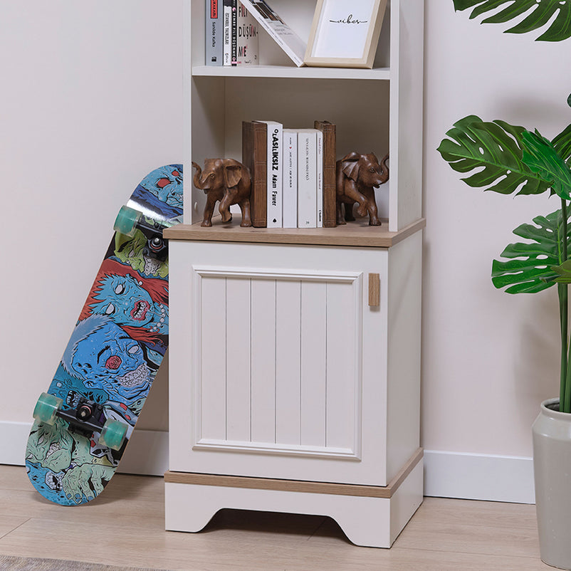 Etajeră 1 ușă Matheo. Realizată din PAL melaminat de grosimi 18 și 30mm și profile din MDF. Camera se distinge prin combinația de culori crem-natur, ușor de ambientat și prin fronturile cu decorațiuni realizate prin tehnologia laser. Topurile au cornișe profilate culoare natur, la fel și mânerele dreptunghiulare din plastic rezistent, ce contrastează puternic cu cremul fronturilor. Un copil energic are nevoie de soluții de depozitare funcționale. Majoritatea pieselor includ sertare adânci, ușor accesibile, dotate cu soft-closing. Toate piesele disponibile: paturi 100x200cm și 140x200, noptieră, dulap, birou și suprapozabil, comodă cu sertare, etajeră înaltă 1 ușă, dulapuri cu 2, 4 sau 5 uși, vor organiza judicios toate lucrurile copilului.