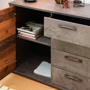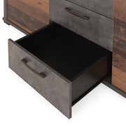 Comodă 4 sertare, 2 uși Aramis. Ideală pentru a mobila dormitorul cu stil, comoda din gama Aramis este o piesă practică și estetică. Aceasta are 4 sertare și 2 uși, potrivite pentru depozitarea riguroasă a lucrurilor voastre. Funcționalitatea este însă devansată de latura estetică, Aramis fiind o comodă care surprinde prin designul special, care se aliniază stilului modern și industrial, subliniat de cromatica bicoloră.