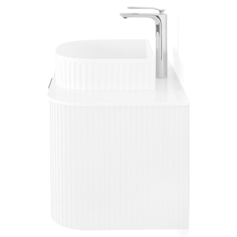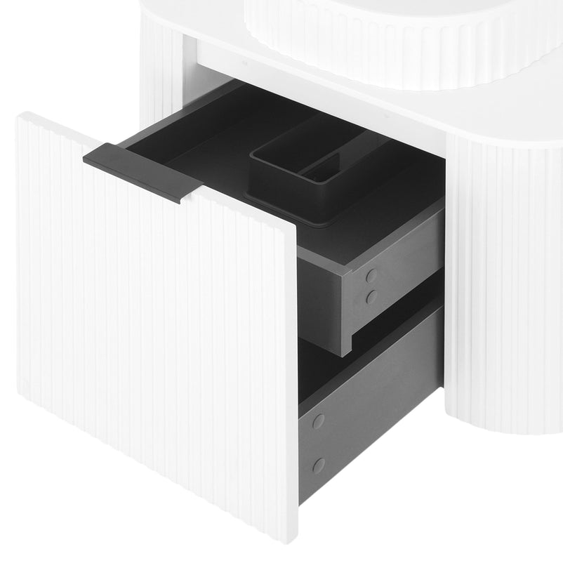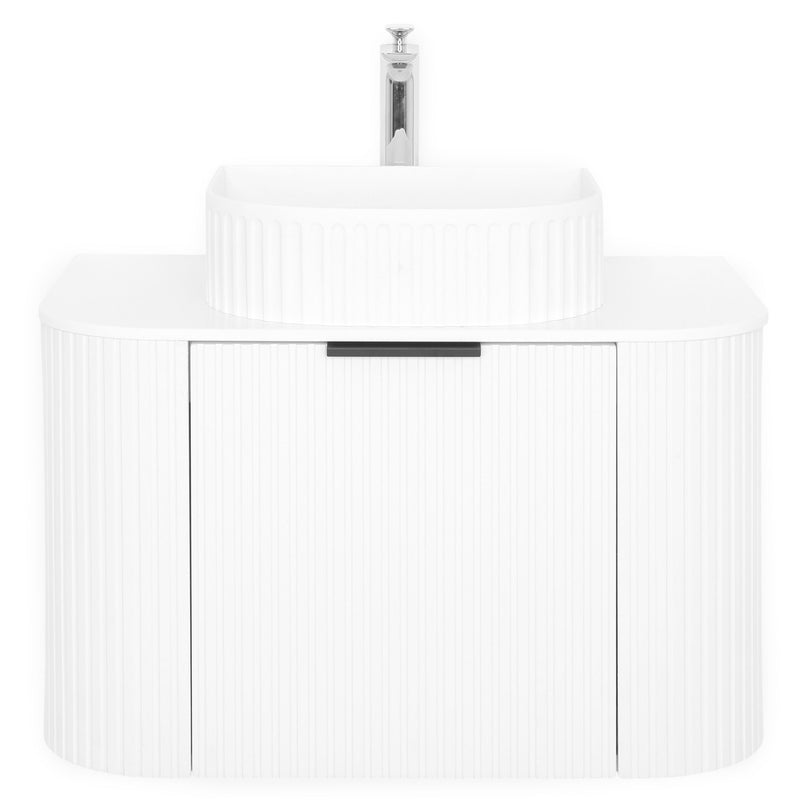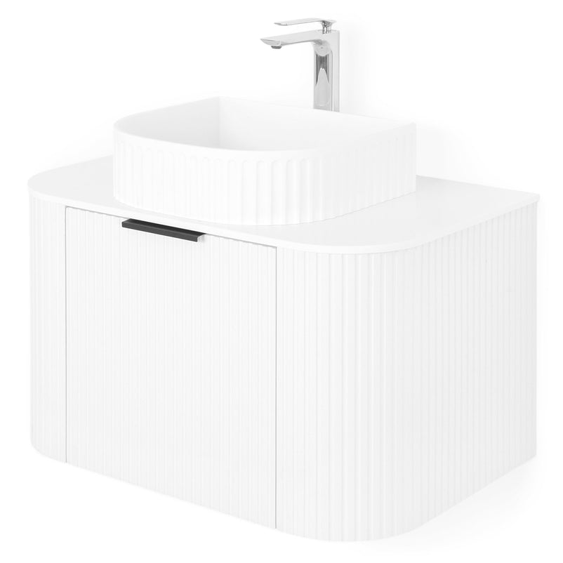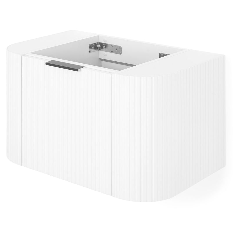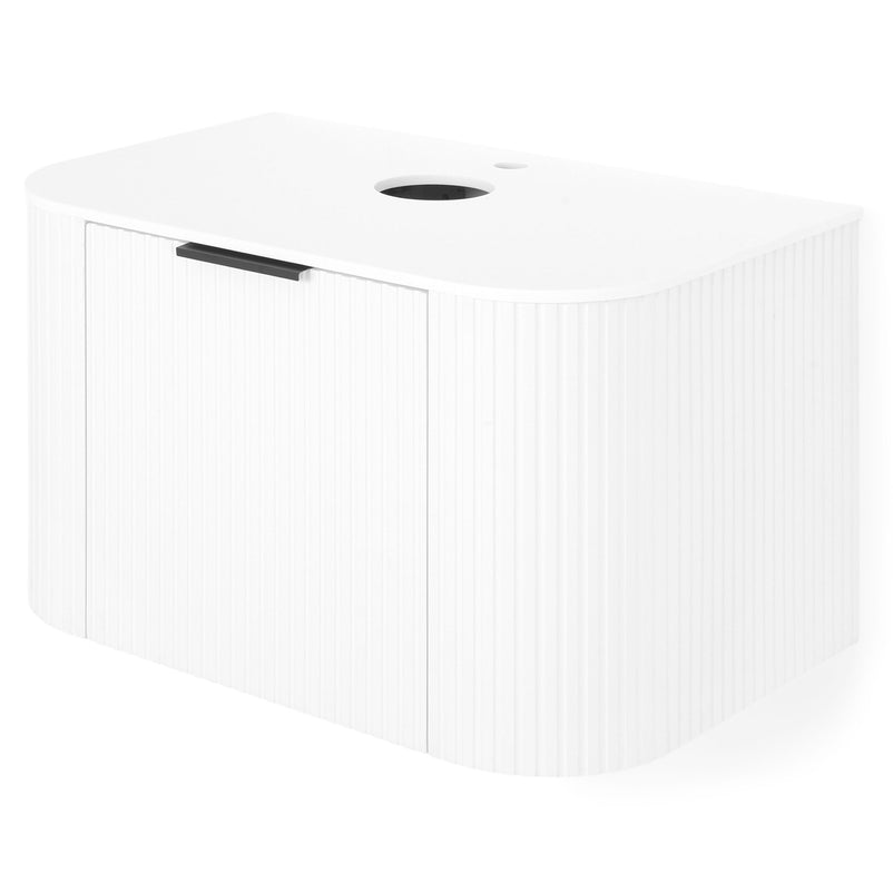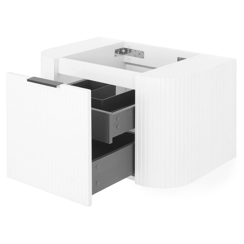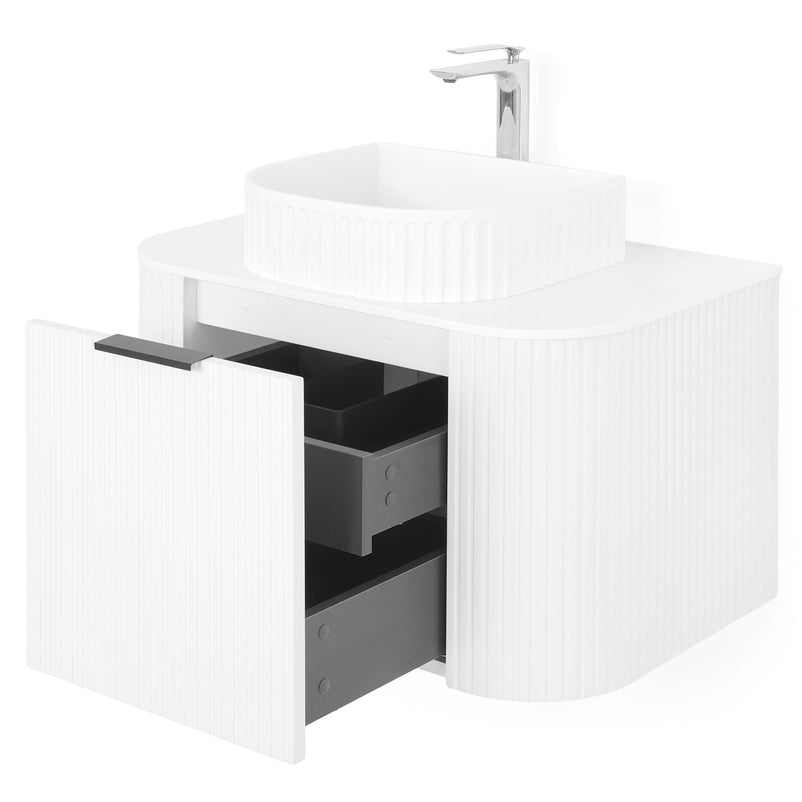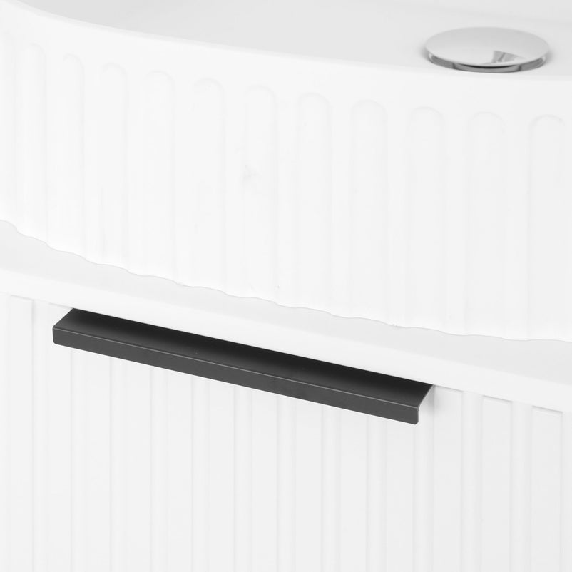 Mască lavoar Arch. Inspirat din coloanele grecești datorită frontului canelat și curbat, corpul pentru baie Arch este realizat din MDF înfoliat și este prevăzut cu sertar cu închidere soft-close și mâner minimalist finisaj negru.