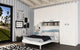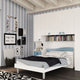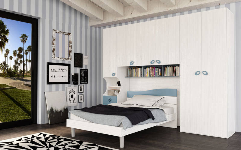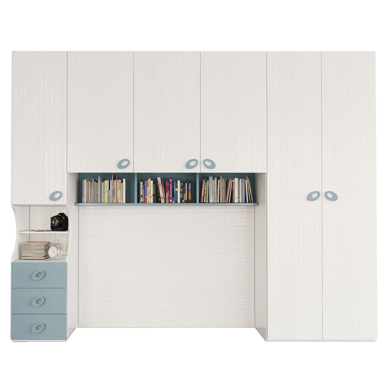 Ansamblu dulapuri suspendate, dulap stânga/ dreapta și panou pentru copii Jimmy. Camera Jimmy este robustă și compactă, salvând spațiul din camera copilului vostru pentru a rămâne mai mult loc altor activități recreative. Mobilierul este realizat din panouri aglomerate din lemn, în finisaje deosebite și o combinație de două culori, alb texturat și albastru. Ansamblul include numeroase spații pentru depozitarea lucrurilor celui mic. Astfel, dulapul cu 2 uși din dreapta patului este utilat cu 2 bare de haine și o poliță; dulapurile suspendate sunt dotate cu 2 polițe pentru depozitare, iar în partea inferioară sunt 3 nișe extrem de utile pentru a acomoda telefonul sau alte lucruri ale copilului. Dulapul din stânga patului include o bară de haine, 2 nișe și 3 sertare în partea inferioară.