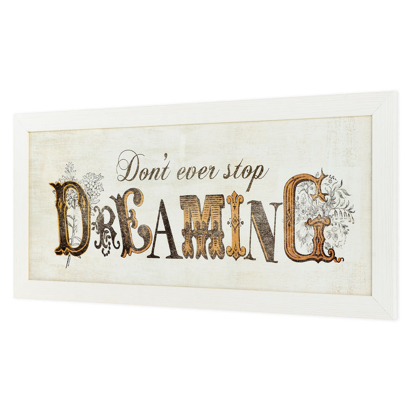 Poster înrămat Dreaming. Posterul înrămat Dreaming poate fi montat în camera copiilor sau în dormitorul vostru, mesajul inscripționat fiind perfect pentru a motiva și inspira zi de zi. Acest poster este confecționat din hârtie, iar rama din lemn completează un accesoriu versatil. Contribuiți la aspect elegant al camerei cu acest poster înrămat care să completeze spațiul cu succes.
