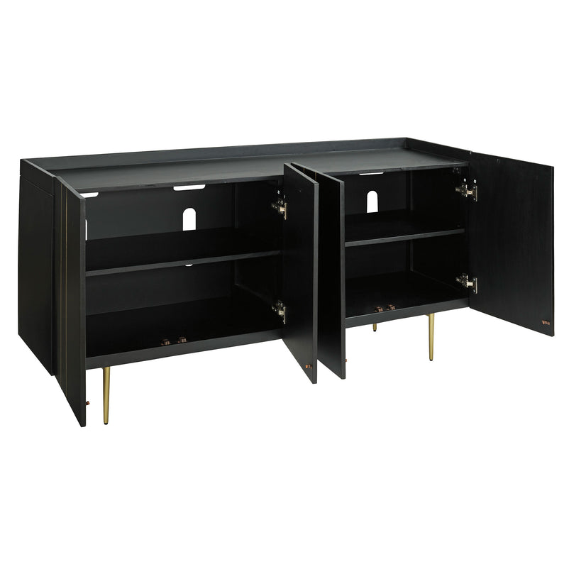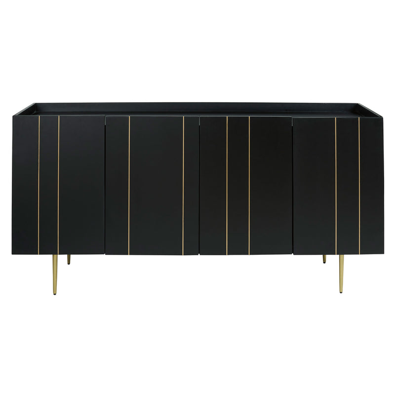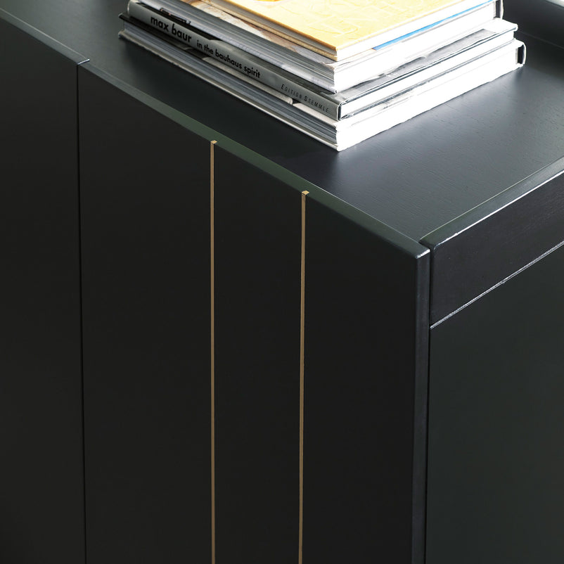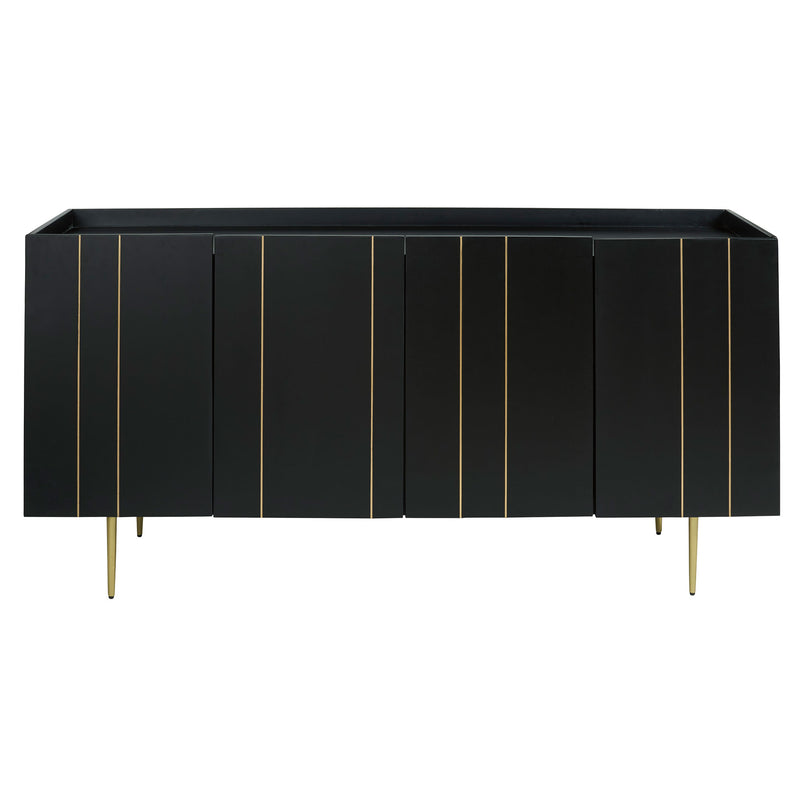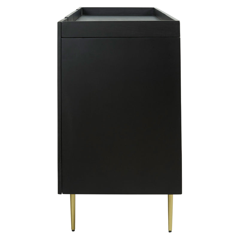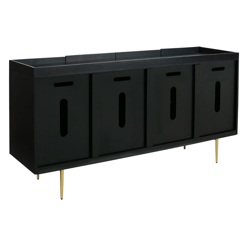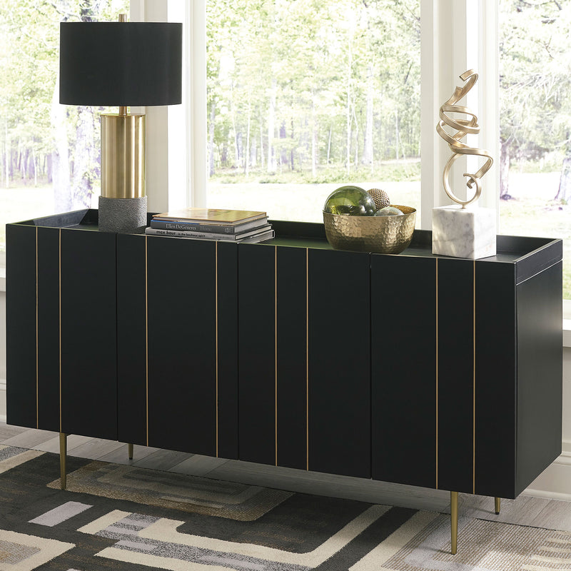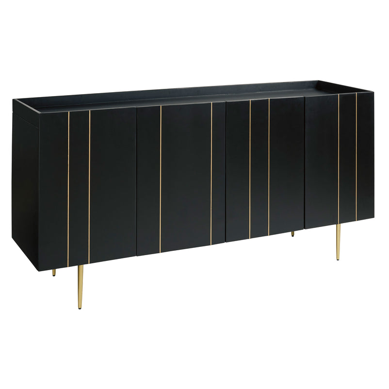 Comodă accent, 4 uși Brentburn. Comoda accent din gama Brentburn este ideală pentru a oferi ambientului vostru o oază de eleganță și stil. Aceasta se aliniază frumos unui stil contemporan, aspectul său glam contribuind la frumusețea sa. Fabricat din materiale calitative, finisajul în negru cu auriu oferă strălucire și un aspect minunat. Designul comodei este îmbunătățit de niște detalii subțiri din alamă și picioare metalice conice, pentru o înfățișare luxuriantă. Comoda oferă un spațiu, unde puteți să vă depozitați lucrurile. De asemenea, puteți așeza pe aceasta orice dorațiune pentru a construi un decor de vis.