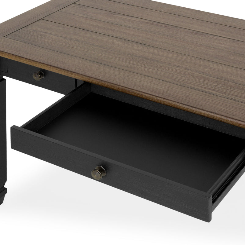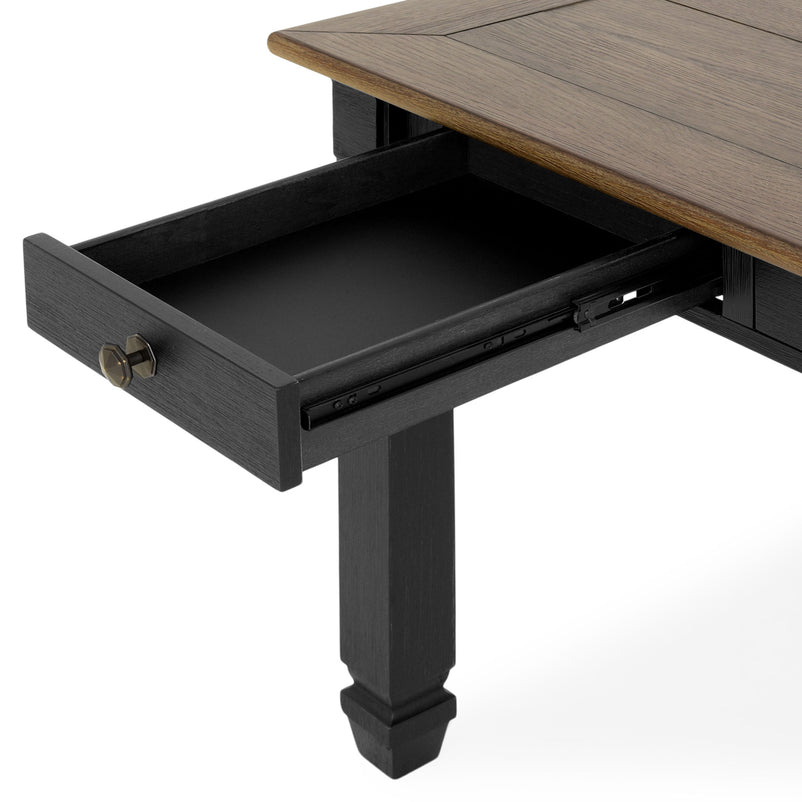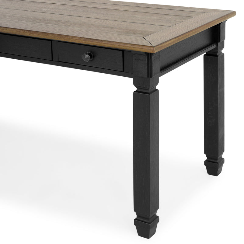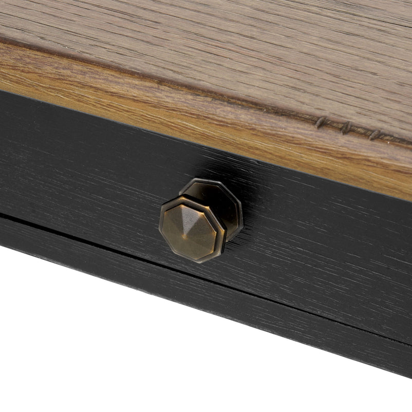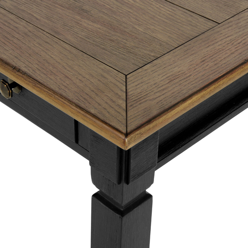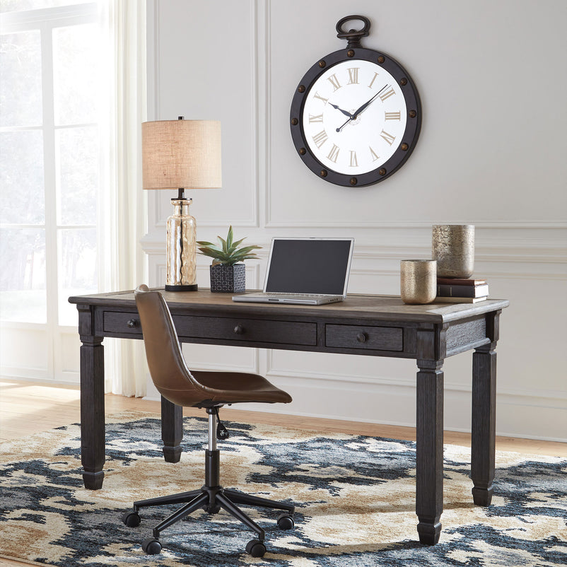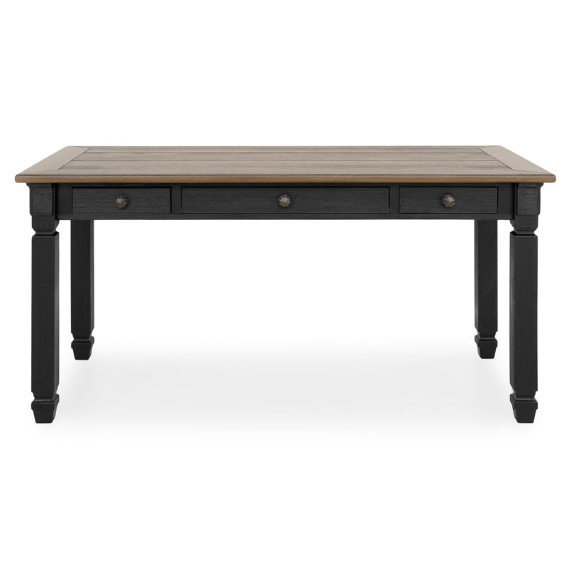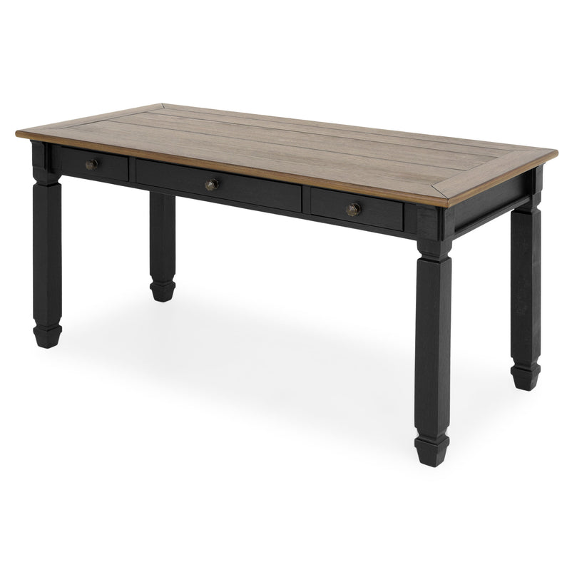 Birou, 3 sertare Tyler Creek. Cromatica sobră a acestui birou cu 3 sertare din gama Tyler Creek oferă decorului un plus de sobrietate, estetica fiind una încântătoare. Acesta este fabricat din lemn, furnir și panouri aglomerate din lemn, finisajul negru texturat conferindu-i o estetică minunată. Biroul vă pune la dispoziție 3 sertare cu alunecare netedă, pe care le puteți folosi în stocarea diverselor lucruri pe care le folosiți când lucrați. Picioarele biroului sunt sculptate cu tact, designul fiind unul deosebit. Cele 3 sertare sunt prevăzute cu butoane în tonuri de bronz antic, completând astfel o piesă de mobilier realizată elegant.