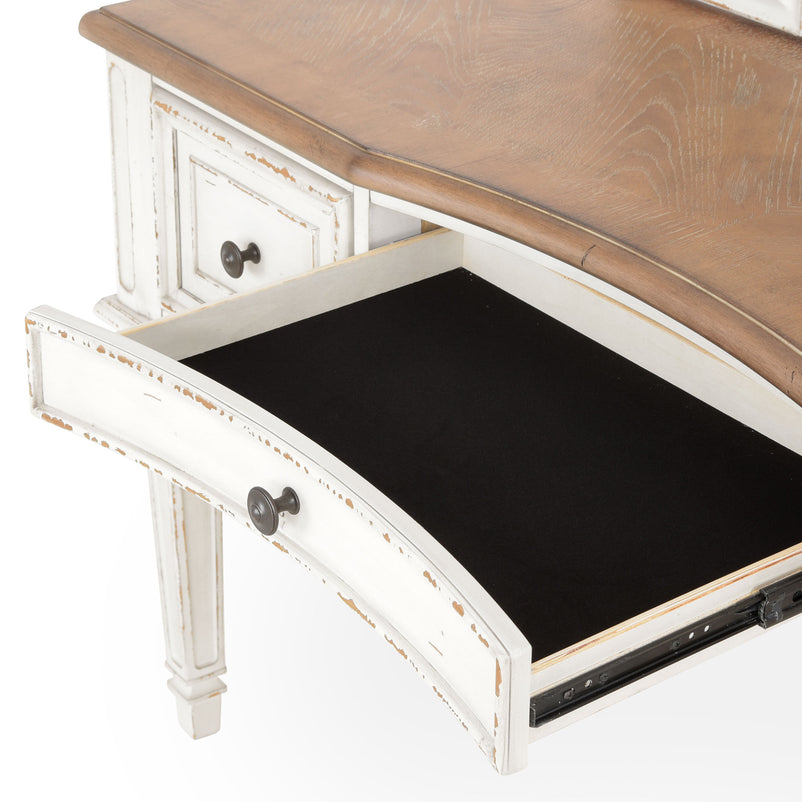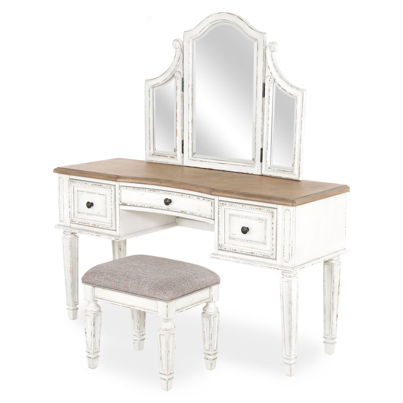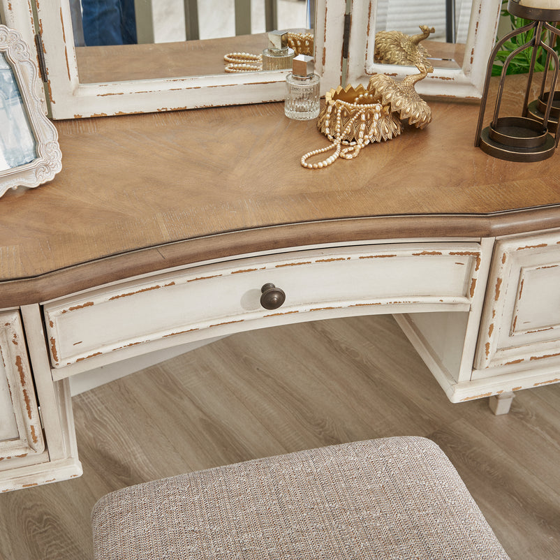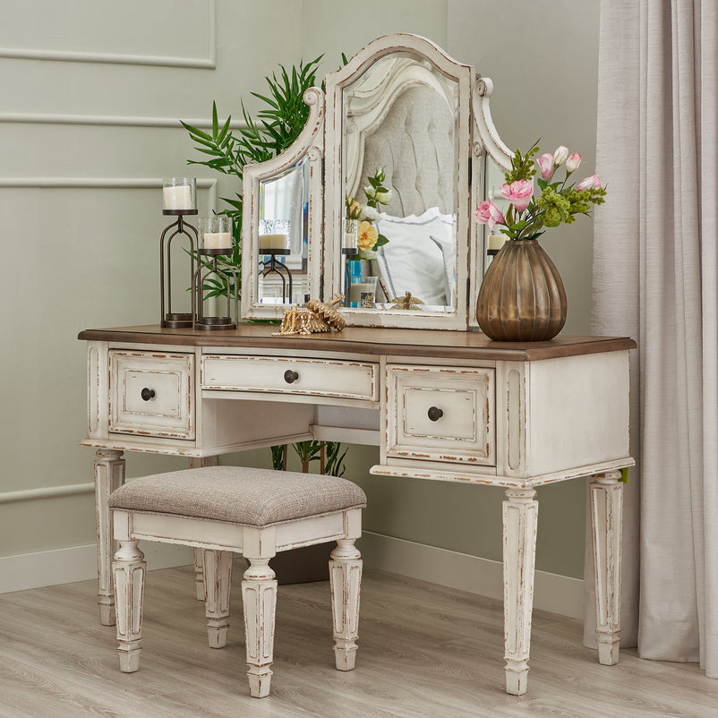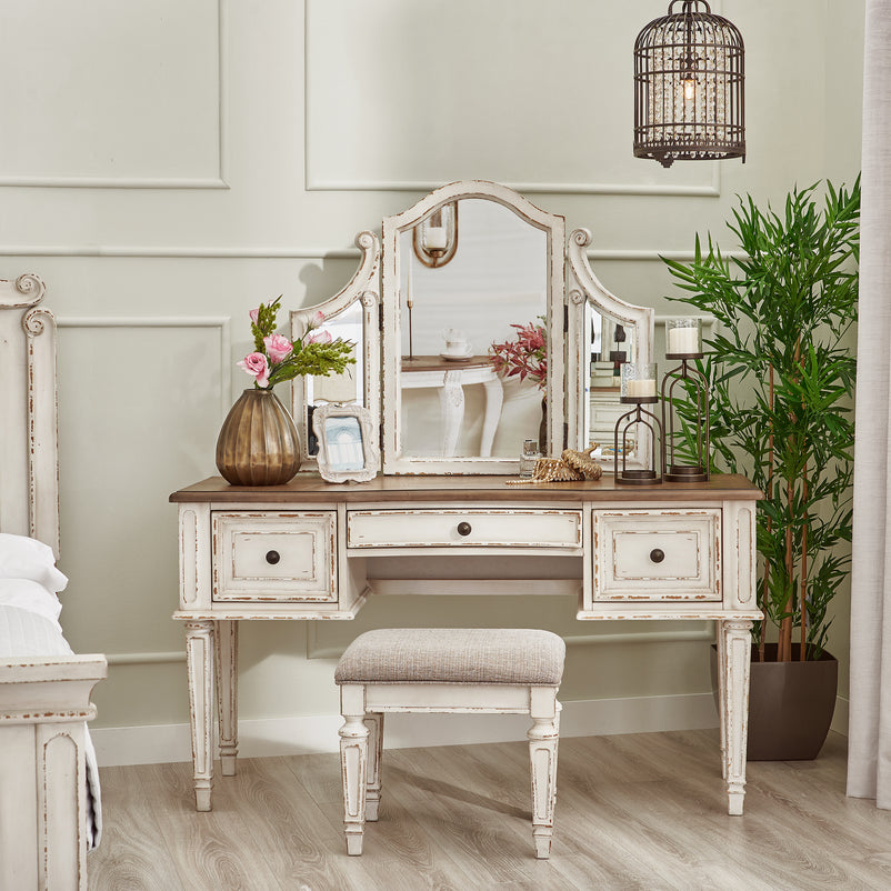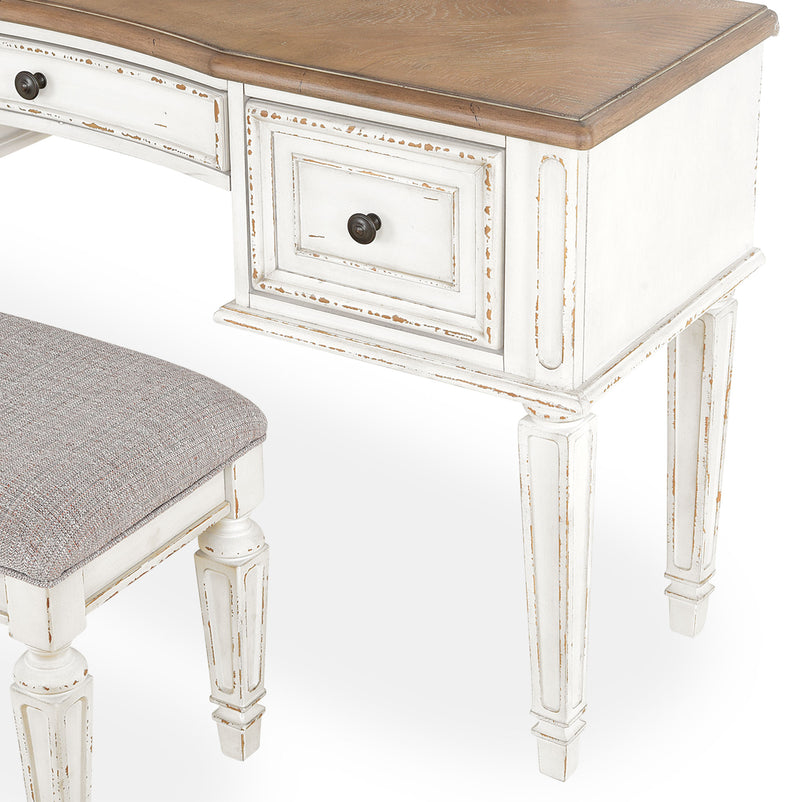 Masă toaletă și taburet Kinsley. Cu un aspect modern, masa pentru toaletă Kinsley aduce în decorul dormitorului vostru un plus estetic. Formele delicate, cu sertare practice și spații generoase ale mesei vă oferă posibilitatea de a depozita diverse produse cosmetice sau de a decora cu obiecte ornamentale și rame foto. Taburetul este completat de o pernă versatilă și rezistentă, asigurându-vă maximum de confort.