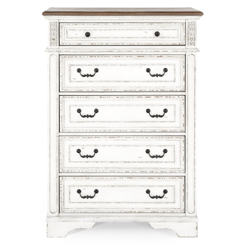 Comodă 5 sertare Kinsley. Comoda este ideală pentru un dormitor în care vreți să adăugați un plus de lumină și stil. Comoda este și foarte practică, datorită spațiului generos de depozitare, unde puteți așeza toate lucrurile de care aveți nevoie, păstrând astfel mereu ordinea în cameră. Comoda este realizată din lemn de plop, furnir de mesteacăn și detalii din polirășină, aceste materiale conferindu-i stabilitate și rezistență.