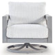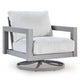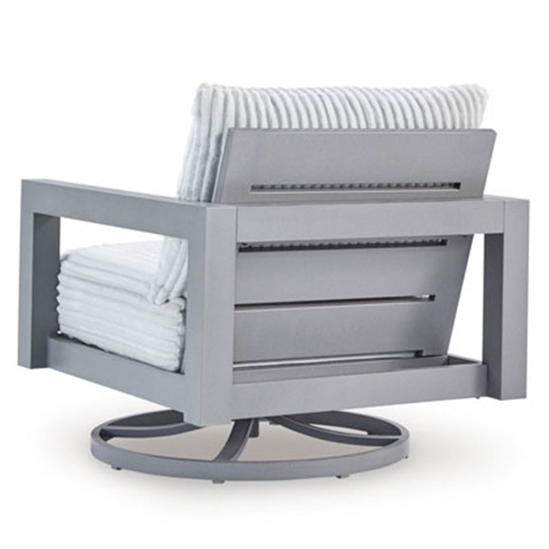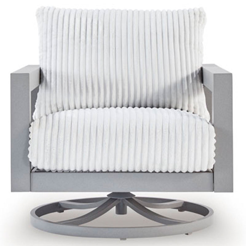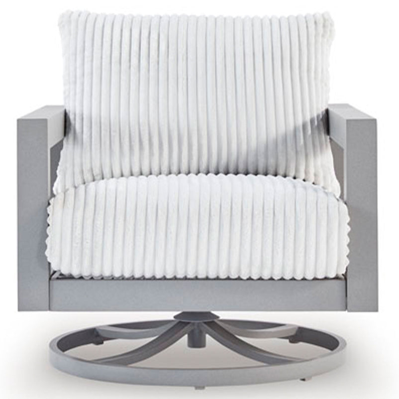 Funcția de rotire la 360° îți permite să interacționezi ușor cu invitații sau să te bucuri de priveliște, fără a te ridica. Pernele sunt realizate din spumă pentru exterior, înfășurată în poliester moale, oferind confort pe termen lung. Husele cu fermoar sunt confecționate din material Nuvella®, recunoscut pentru rezistența la razele UV și ușurința în curățare. Pentru pete persistente, se poate folosi o soluție diluată cu clor (4 oz. clor la 28 oz. apă).