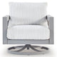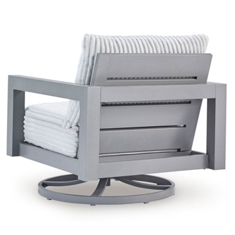 Set mobilier terasă/grădină, 2 fotolii rotative, canapea și măsuță Moonlight. Redefinește-ți spațiul de relaxare cu setul de exterior Moonlight, compus din două fotolii rotative, o canapea confortabilă și o măsuță de cafea cu design modern. Acest set îmbină stilul contemporan cu materiale rezistente, perfecte pentru utilizare în aer liber. Cadrul din aluminiu, ușor și durabil, este completat de perne moi din spumă pentru exterior, înfășurate în poliester și acoperite cu huse din material Nuvella®, rezistent la razele UV și murdărie, ușor de curățat. Husele sunt prevăzute cu fermoar, iar setul include patru perne decorative pentru un plus de stil.