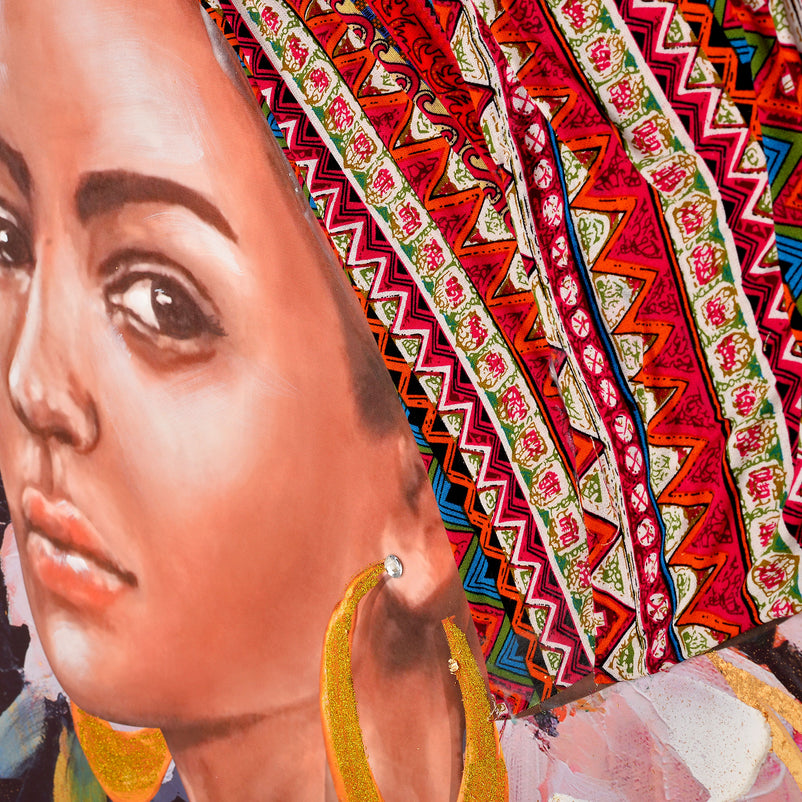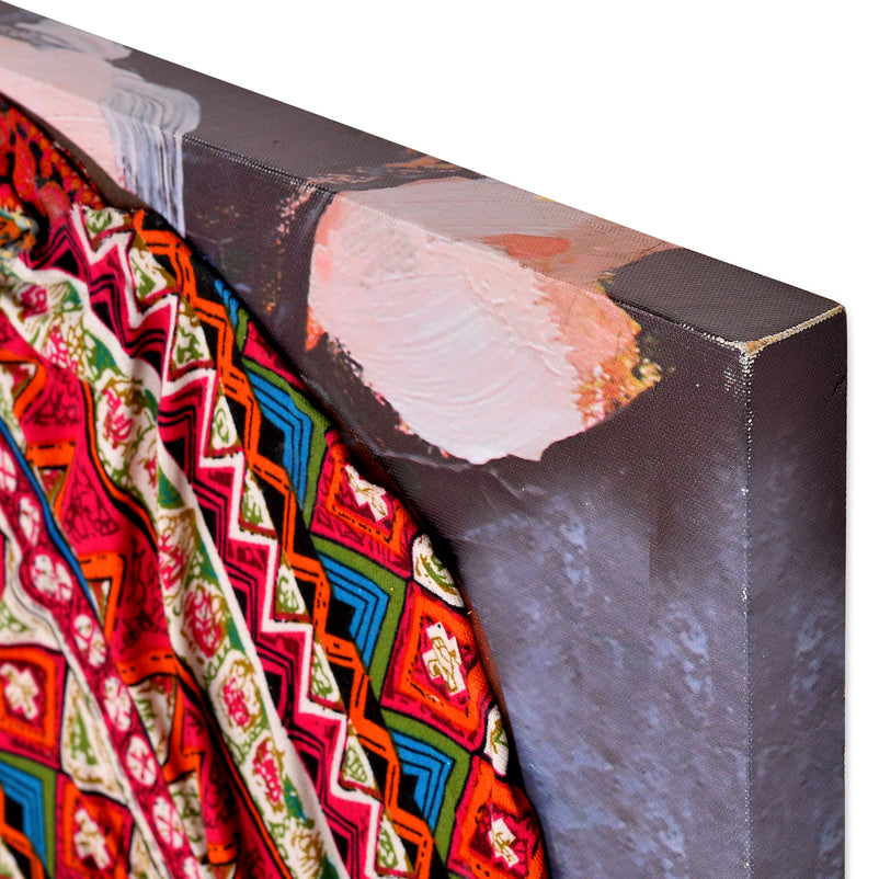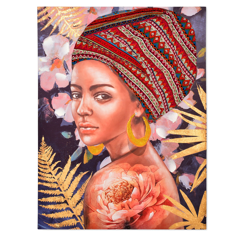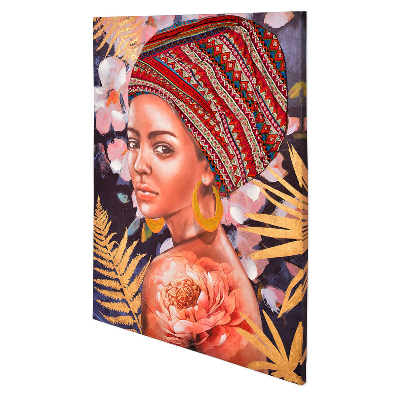 Tablou Ziva I. Eleganța și delicatețea sunt cele două atribute ce descriu perfect tabloul Ziva I. Modelul exprimă feminitate la superlativ și poate contribui la un ambient viu colorat, plin de note exotice. Materialul din care este fabricat accesoriul de pe capul modelului este diferit față de restul tabloului, putând ieși cu ușurință în evidență.