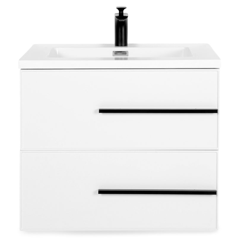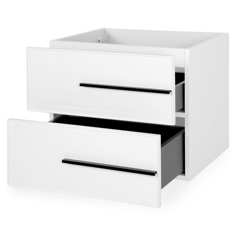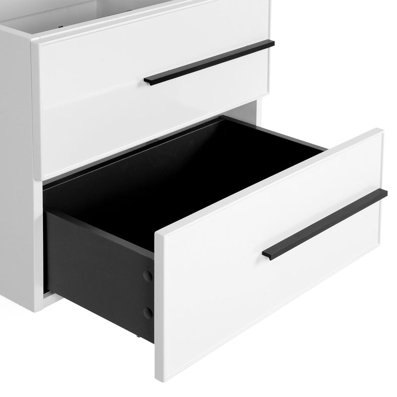 Mască lavoar 2 sertare Bella. Amenajați baia cu o mască pentru lavoar cu 2 sertare din gama Bella, cu care să dați un aer fresh acesteia. Această mască este construită din panouri aglomerate din lemn, finisajul în alb lucios cu negru emanând o cromatică frumoasă care vă va capta atenția. Cele 2 sertare sunt potrivite pentru a vă depozita lucrurile utile băii, acestea fiind suficient de încăpătoare.