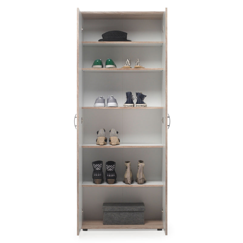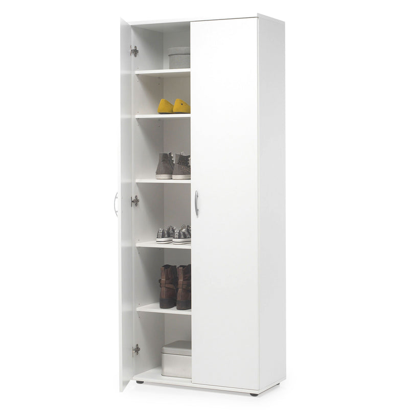 Comodă pantofi Jesse. Gama Jesse este o alegere funcțională și estetică care contribuie la mobilarea spațiului din holul vostru. Piesele de mobilier ale gamei sunt practice, cu spații de depozitare utile și care vă păstrează încăperea organizată și aerisită. Comoda este echipată la interior cu 5 polițe, iar pe fiecare încap 3 perechi de încălțăminte. Mânerele și piciorușele acesteia sunt din plastic. Cromatica neutră este versatilă și contribuie la un decor luminos.