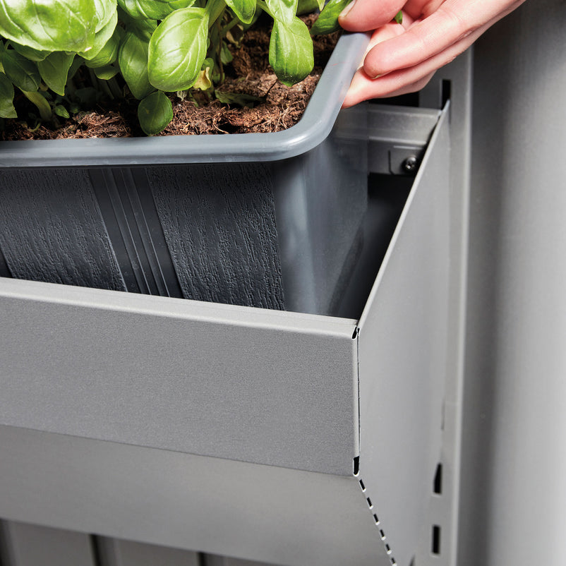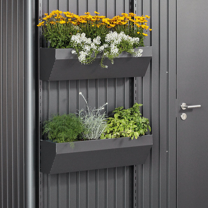 Set 2 ghivece Flora. Setul de două ghivece Flora este un accesoriu perfect, ușor de utilizat pentru magaziile de grădini. Ghivecele Flora este o combinație de două șine de oțel robuste și cutii de flori, ideale pentru iubitorii de grădinărit sau pur și simplu pentru adăugarea unei note florale magaziei voastre. Șinele de susținere permit mișcarea reglabilă pe înălțime, iar cutiile includ inserții din plastic pentru o plasare mai eficientă.