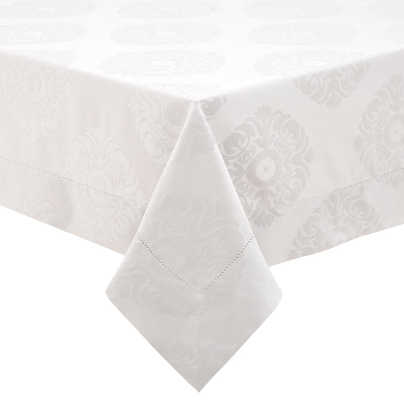 Față de masă Palace. Bucurați-vă de o experiență delicată și primitoare a servirii mesei, oferită de fața de masă din gama Palace, realizată în totalitate din bumbac, cu inserții de design cu jocuri geometrice florale. Tonul neutru și luminos amplifică o atmosferă plăcută și contribuie la semiotica invitației la masă.