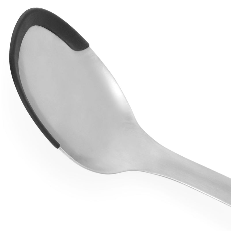 Set 3 ustensile Balance. Acest set de unelte de bucătărie de 3 bucăți este un must-have pentru orice bucătar, conține un polonic, o spatulă cu fante și o lingură de servire. Cele 3 ustensile de bucătărie sunt realizate din oțel inoxidabil de înaltă calitate în combinație cu silicon moale pentru a vă proteja vasele de zgârieturi în timpul gătitului. Nu zgârie stratul antiaderent al vaselor tale de gătit. Bucla de agățare permite o depozitare ușoară. Oțel inoxidabil de înaltă calitate. Set de ustensile versatil pentru utilizarea de zi cu zi. Mâner fabricat din plastic reciclat.