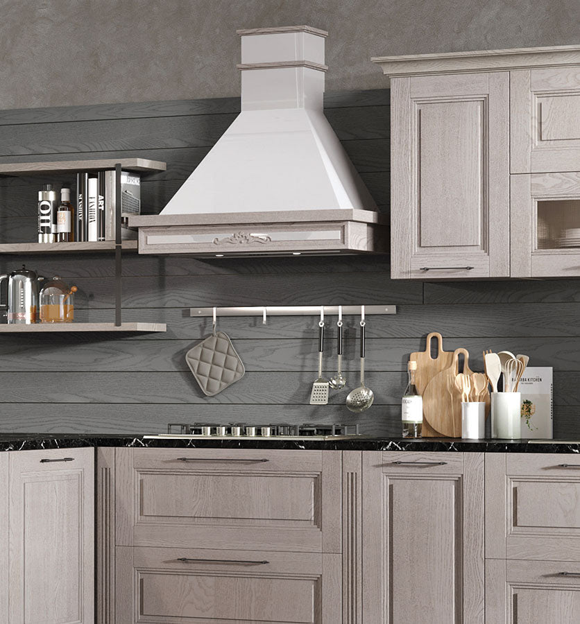 Bucătăria LUCIA are fronturi de grosime 24 mm din lemn masiv de frasin și tăblie din lemn masiv de frasin cu grosime de 9.5 mm. Structura este realizată din panouri aglomerate din lemn de grosime 18 mm. Finisaje disponibile sunt : alb patinat; gri patinat; crem patinat ,albastru patinat; verde patinat.