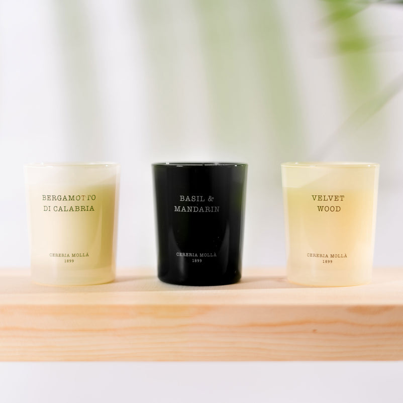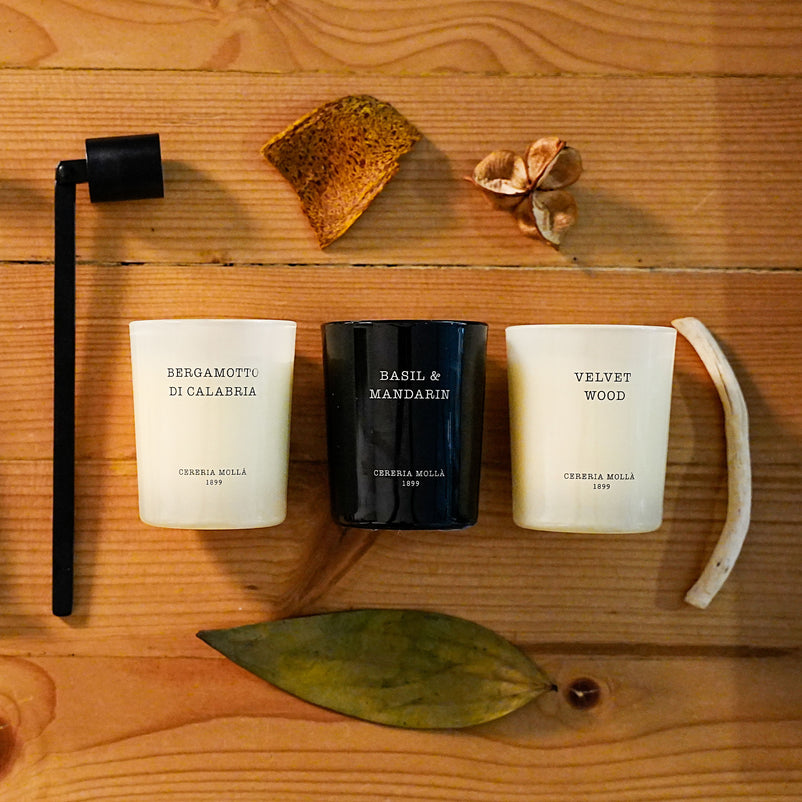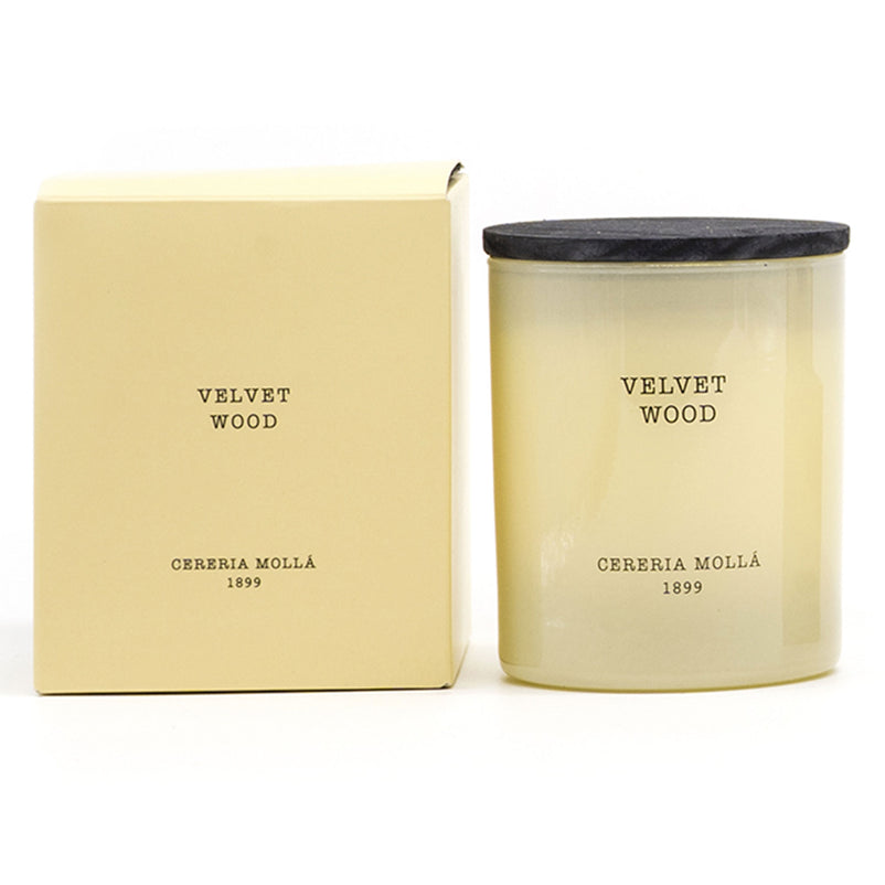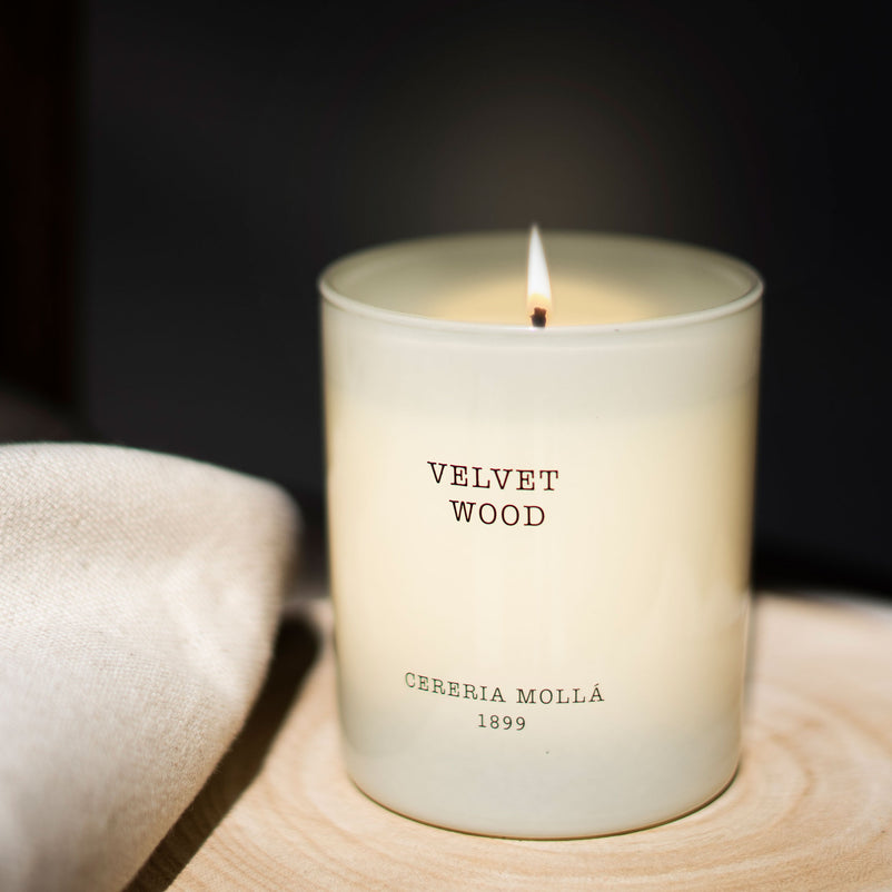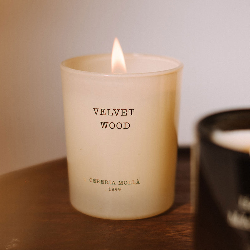 Lumânare parfumată Cereria Molla. Naturalețea condimentelor aromatice creează o atmosferă profundă și caldă. Lemnul de catifea, cu note de tutun și vanilie, ne transportează într-un spațiu confortabil care ne face să ne simțim ca acasă.