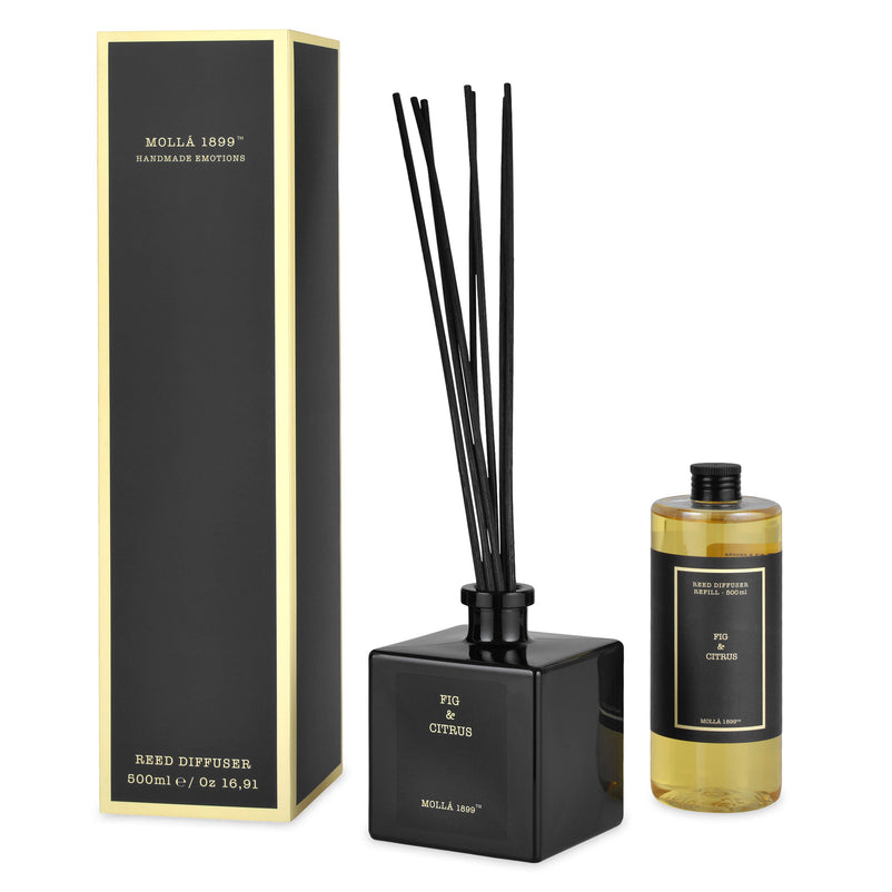 Difuzor parfum cameră Cereria Molla. Aroma: Fig & Citrus este prospețime, lumină și fericire. Este o amestecare între note citrice și cremoase care ne duce la o trezire a naturii. Smochinul & Citricele ne invadează cu esență și bunăstare.