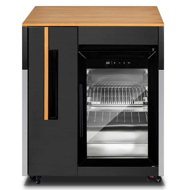 Corp cu frigider, exterior Element. Realizat din inox și lemn de teak. Include un frigider pentru exterior cu o capacitate de 60L (aproximativ 20 sticle de vin). Prevăzut cu sertar soft-close pentru depozitare sticle. Prevăzut cu roți.