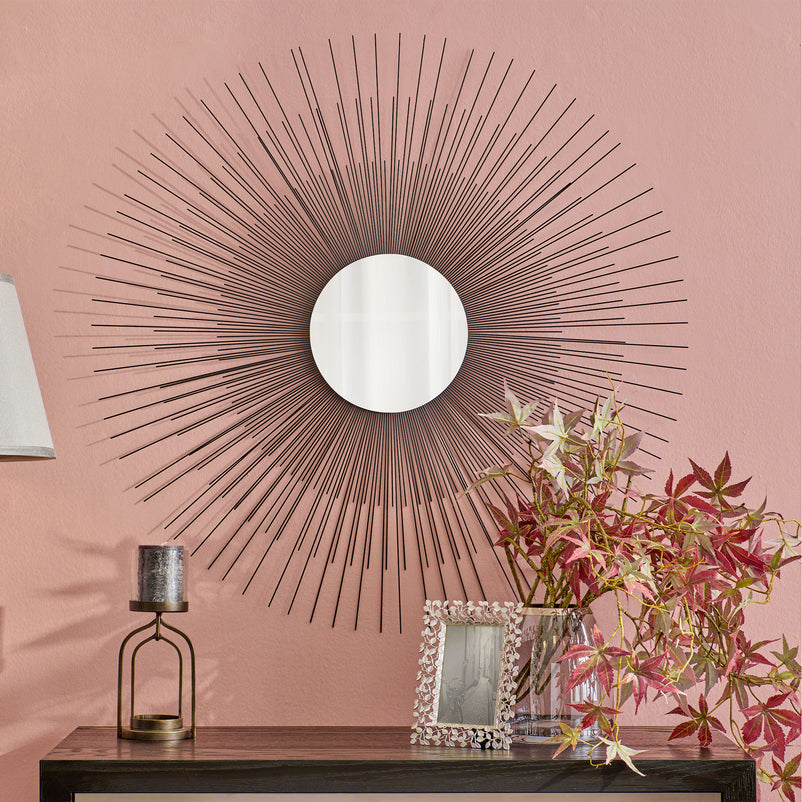 Oglindă Soleil. Oglinda Soleil este o piesă utilă și, în același timp, un accesoriu deosebit. Realizată din metal de culoare aurie, oglinda Soleil are forma unui soare, dobândind un aspect unic și extrem de modern.