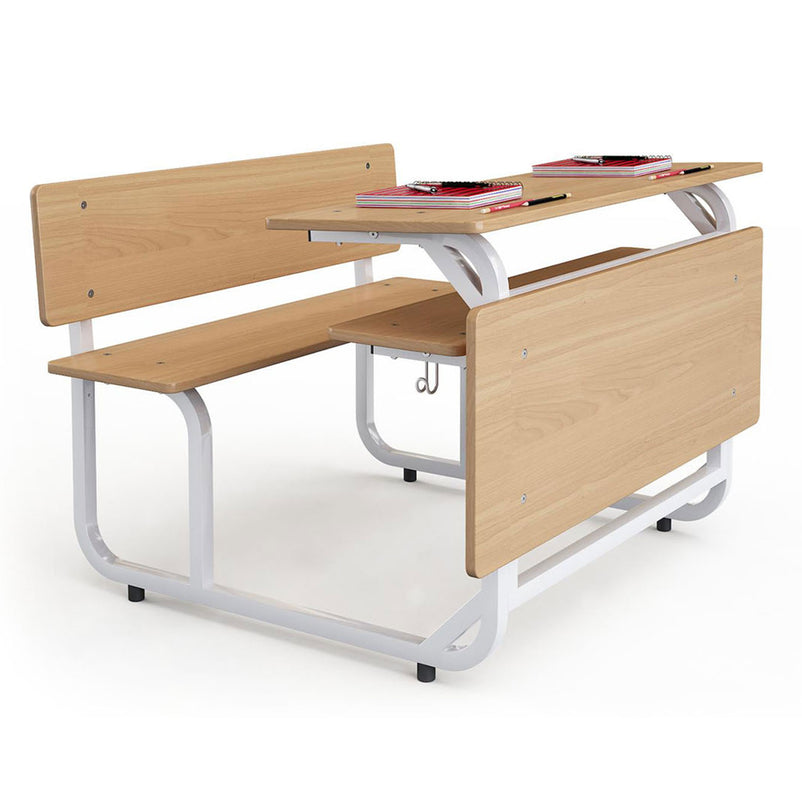 Mobilier școlar Topaz. Setul are structură metalică monobloc, din profile ovale, vopsite în câmp electrostatic, având tălpile prevăzute cu garnituri din plastic rezistent, pentru protecția pardoselii. Blatul este realizat din PAL melaminat, rotunjit la colțuri, finisaj natural. Dotat cu poliță din PAL melaminat pentru depozitare cărți și caiete și prevăzută cu paravan frontal din PAL melaminat în culoare; include 2 cârlige metalice laterale pentru agățat ghiozdanele. Banca cu 2 locuri este realizată din aceleași materiale cu pupitrul. Setul este stabil și rezistent, oferă ergonomie și confort în timpul orelor școlare la gimnaziu și liceu. Un mediu de învățare ergonomic în școli crește concentrarea și atenția elevilor, favorizând o mai bună asimilare a cunoștințelor. Confortul fizic reduce oboseala și permite elevilor să se concentreze mai mult pe lecții și pe activitățile din clasă. Mobilierul școlar modern, cu design atractiv și dimensiuni adaptate vârstei copiilor, stimulează creativitatea și oferă o atmosferă plăcută pentru învățare.