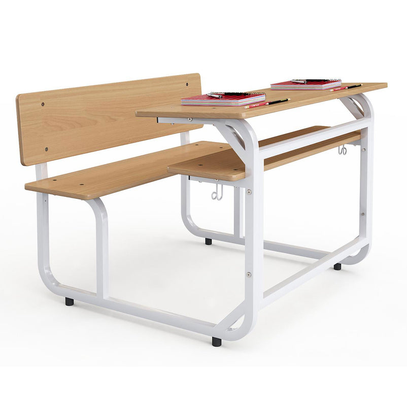Mobilier școlar Topaz. Setul are structură metalică monobloc, din profile ovale, vopsite în câmp electrostatic, având tălpile prevăzute cu garnituri din plastic rezistent, pentru protecția pardoselii. Blatul este realizat din PAL melaminat, rotunjit la colturi, finisaj natur. Dotat cu poliță din PAL melaminat pentru depozitare cărți și caiete; include 2 cârlige metalice laterale pentru agățat ghiozdanele. Banca de 2 locuri este realizată din aceleași materiale cu pupitrul. Setul este stabil și rezistent, oferă ergonomie și confort în timpul orelor școlare de gimnaziu și liceu.