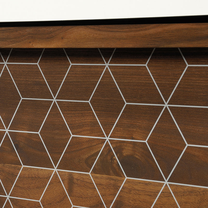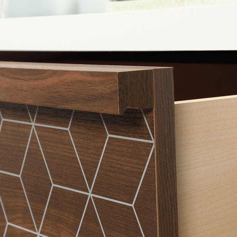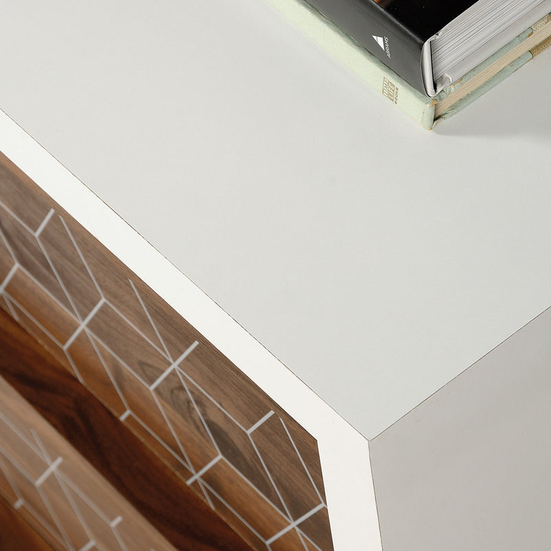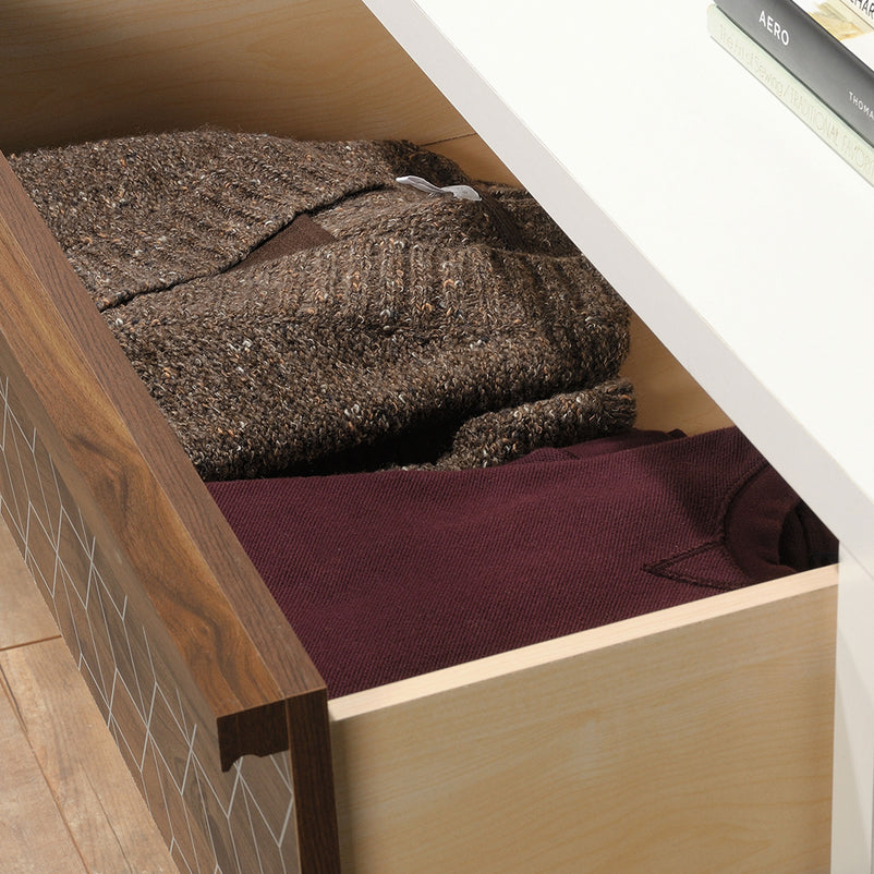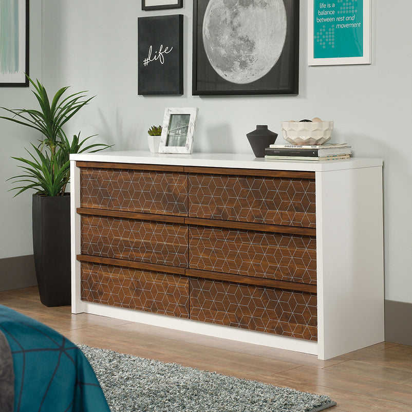 Comodă 6 sertare Harvey Park. Comoda Harvey Park este o piesă practică și modernă, care contribuie într-un mod inedit la amenajarea interioară a livingului. Datorită designului modern și cromaticii versatile, este ușor de alăturat altor piese de mobilier. Este prevăzută cu 6 sertare cu glisare ușoară, oferind un spațiu generos pentru depozitare. Fronturile sertarelor prezintă un model geometric din melamină.