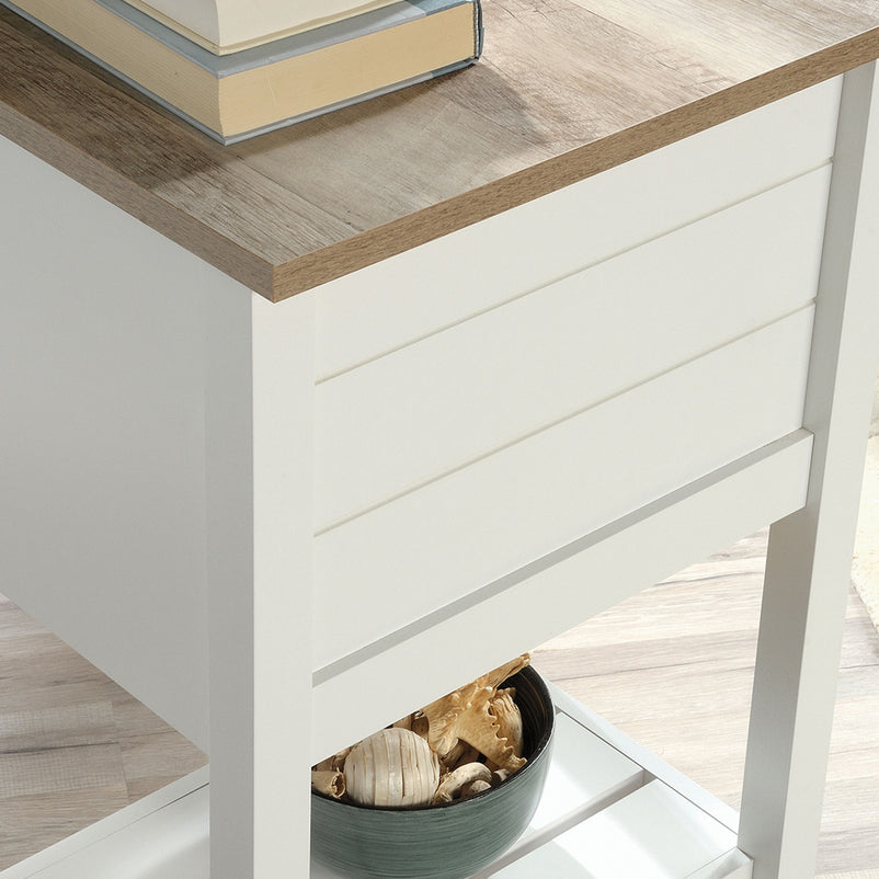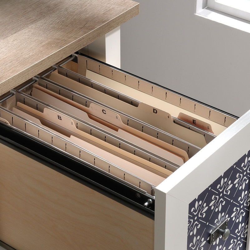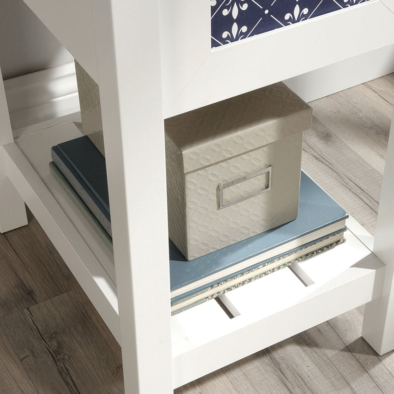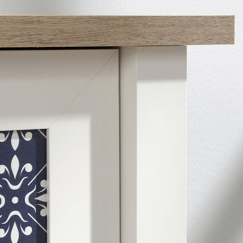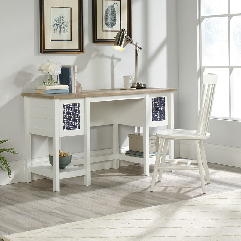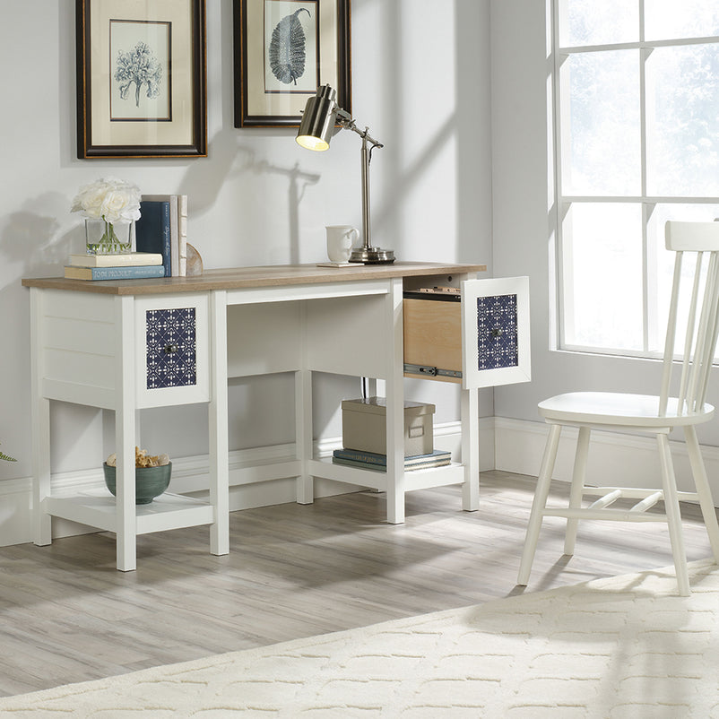 Birou Cottage Road. Zilele în care lucrați de acasă sunt mai productive atunci când aveți un spațiu de lucru organizat. Biroul din gama Cottage Road vă permite să vă desfășurați activitatea într-un cadru adecvat. Are 2 sertare și 2 polițe în partea inferioară, în care să păstrați lucrurile de care aveți nevoie la îndemână. Decorul prezent pe fronturile sertarelor este din melamină, iar mânerele acestora sunt metalice.