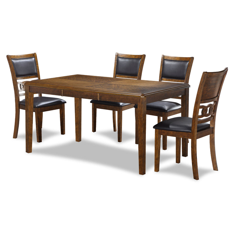 Set mobilier masă și 4 scaune Gya. Totul într-un colet, simplu de transportat și manipulat. Un set de dining perfect pentru a lua masa cu prietenii sau familia, confortabil și rezistent în timp. Inlay-ul decorativ din furnir natural, existent pe top, este reprezentativ pentru gama Gya.