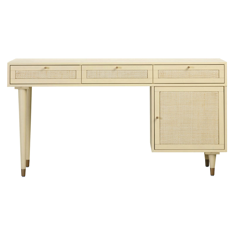 Birou Sierra. Birou Sierra modern cu design în linii drepte, elegant, cu detalii atent prelucrate care combină materiale naturale: lemnul de salcâm, împletitura din trestie și metalul. Produsul este realizat manual de meșteri iscusiți în arta mobilierului. Împletitura este din trestie naturală și este realizată manual pe o suprafață generoasă de mobilier, dar de efect, precum frontul de sertar sau frontul de ușă. Biroul Sierra are picioare conice,înalte 17cm-69cm, elegante, realizate din lemn masiv de salcâm, cu un detaliu metalic în ton auriu.