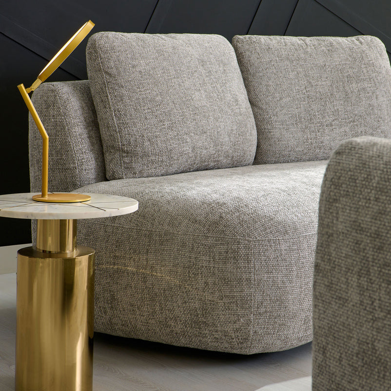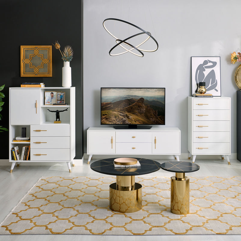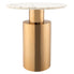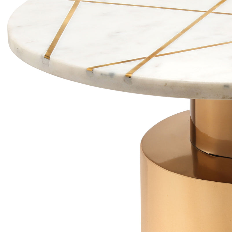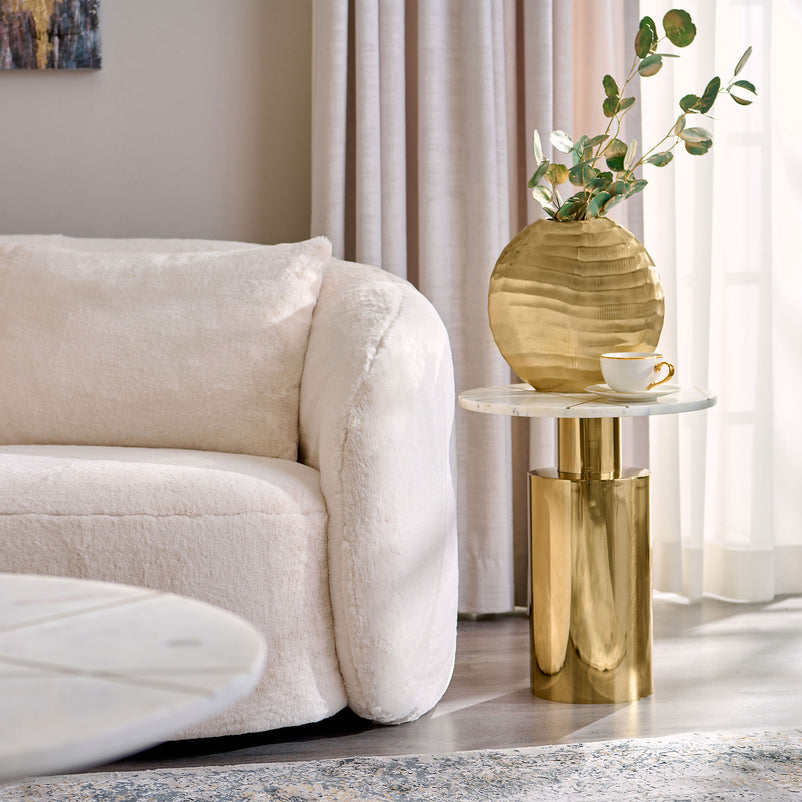Măsuță colț Marmo. Decorați livingul cu o piesă în forme atmosferice din gama Marmo. Măsuța de colț Marmo, realizată din marmură și metal, are un design circular al topului, proiectat ca o platformă înaltă din marmură. Piciorul de susținere continuă jocul vizual prin designul cilindric în două trepte de grosime, cu finisaj auriu, completând piesa cu aspect futuristic ideală pentru un living modern.