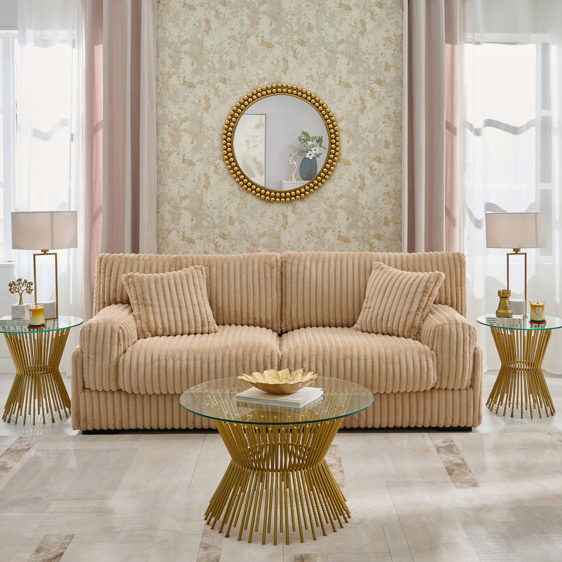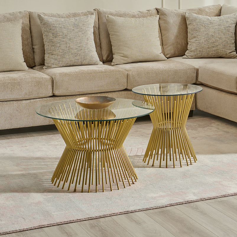 Măsuță colț Marisa. Măsuța din gama Marisa este o alegere elegantă, care va contribui semnificativ în decorul încăperii voastre. Designul său este unul aparte, având un blat din sticlă transparentă care stă pe o structură în formă de clepsidră, formată din elemente în finisaj auriu satinat. Măsuța se va integra perfect în decoruri moderne, extravangante.