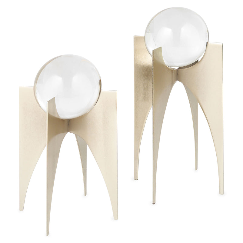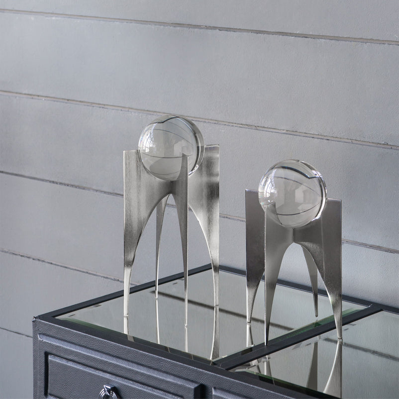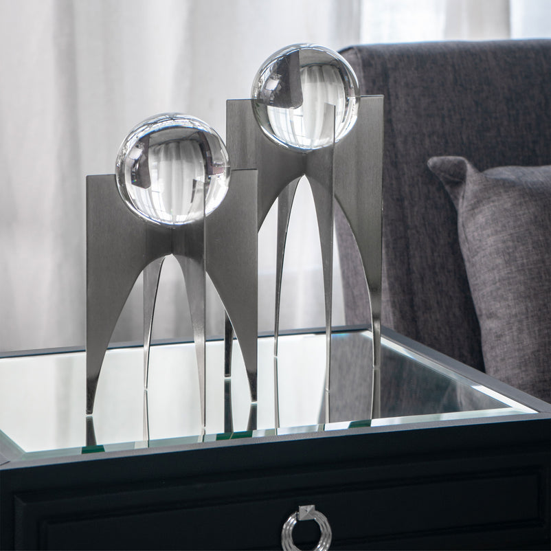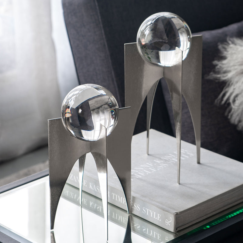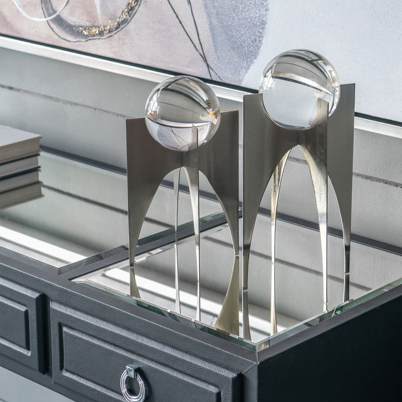 Set 2 decorațiuni Bergen. Decorați încăperea cu un obiect care va atrage, cu siguranță, privirile invitaților voștri, care se remarcă prin formele creative, de inspirație abstractă și care aduce un plus de dinamism atmosferei din camera voastră. Decorațiunea comunică echilibru prin contraste, fiind reprezentată prin suportul în forme stricte și incisive ale sferei delicate.