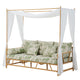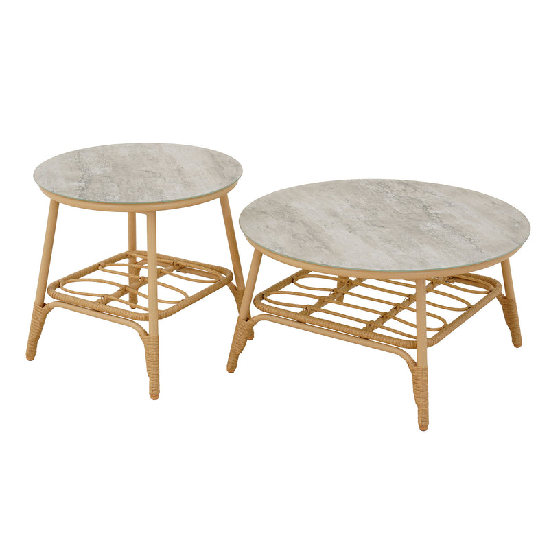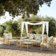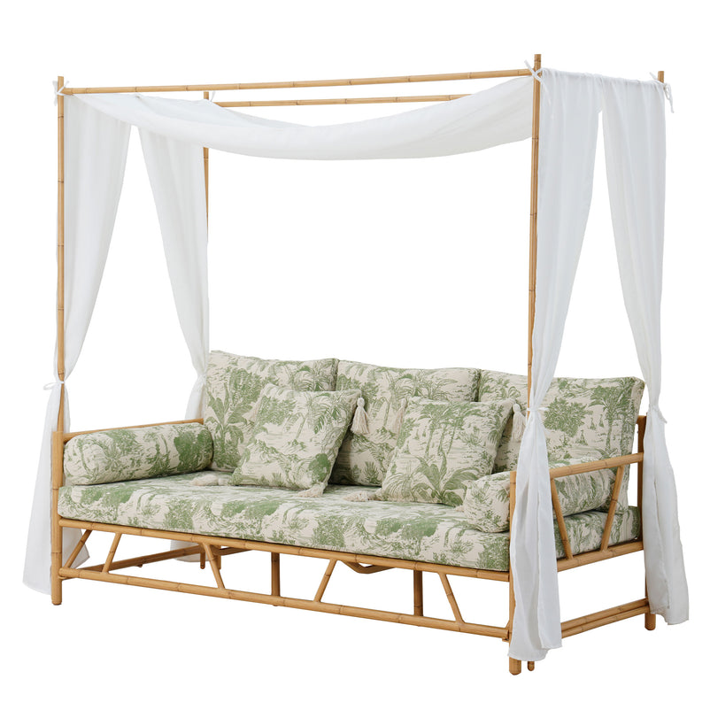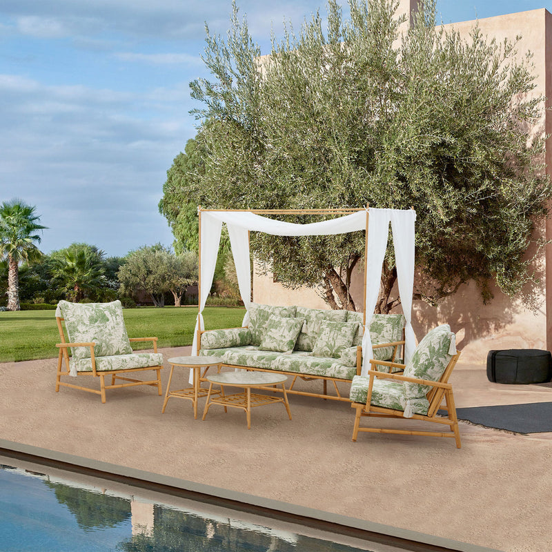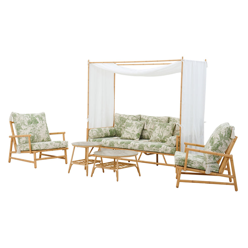 Set mobilier terasă/grădină, 2 fotolii, canapea cu baldachin și 2 măsuțe Warsaw. Colecția WARSAW oferă o experiență luxoasă și liniștită, îmbinând confortul cu estetica naturală. Versiunea cu structură de copertină îmbunătățește atmosfera exterioară, oferind protecție de umbră prin parasolarul din pânză și perdelele care creează un mediu relaxant, asemănător unei vacanțe acasă. Fotoliile și canapelele sunt concepute pentru a reproduce detaliile intricate ale bambusului, cum ar fi venele, nodurile și nuanțele naturale, prin tehnologia de transfer de căldură. Această măiestrie, realizată de meșteșugari pricepuți, decorează cadrul din aluminiu, oferind durabilitate și stil.