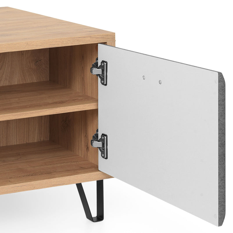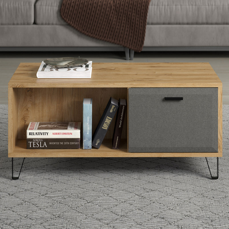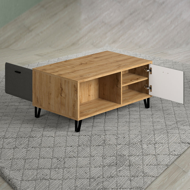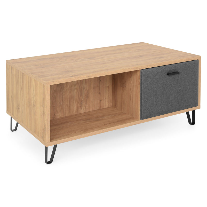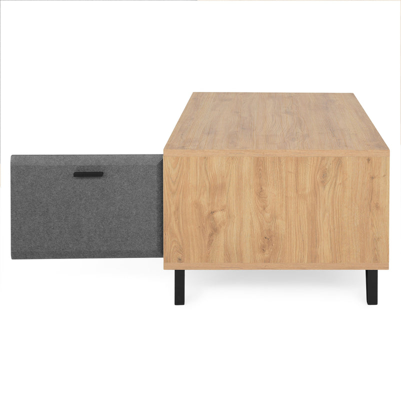 Măsuță cafea Felt. Completați decorul cu măsuța de cafea din gama Felt pentru a crea un mediu ideal pentru socializare și petrecerea momentelor de pauză de peste zi. Măsuța, într-un contrast elegant de stejar și gri, vă mai pune la dispoziție și trei spații de depozitare, dintre care două cu ușă.