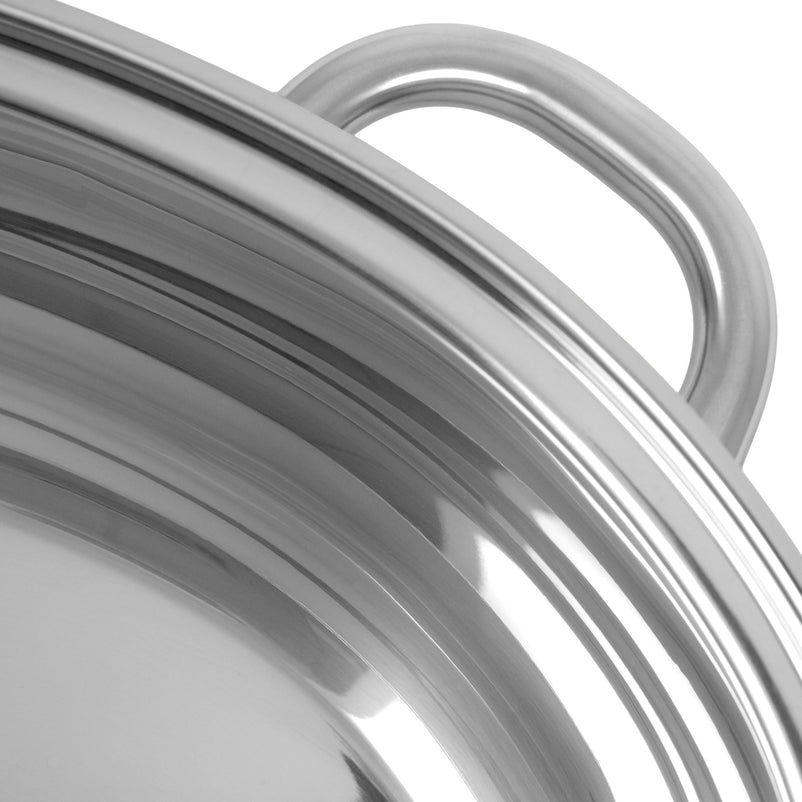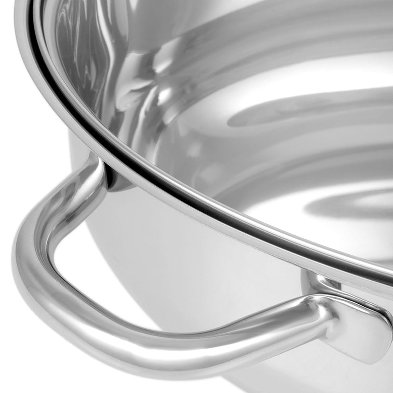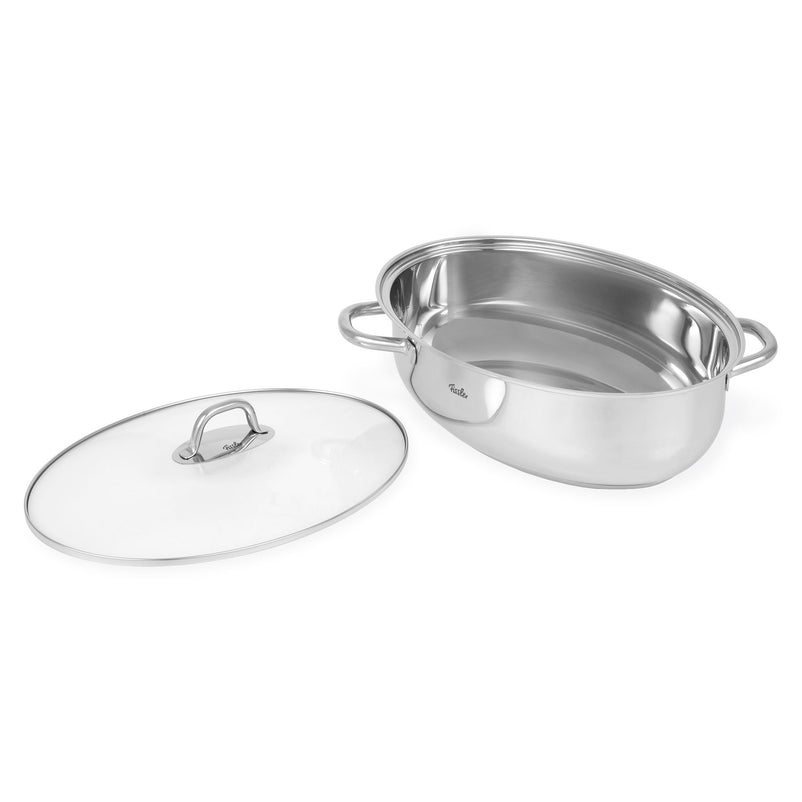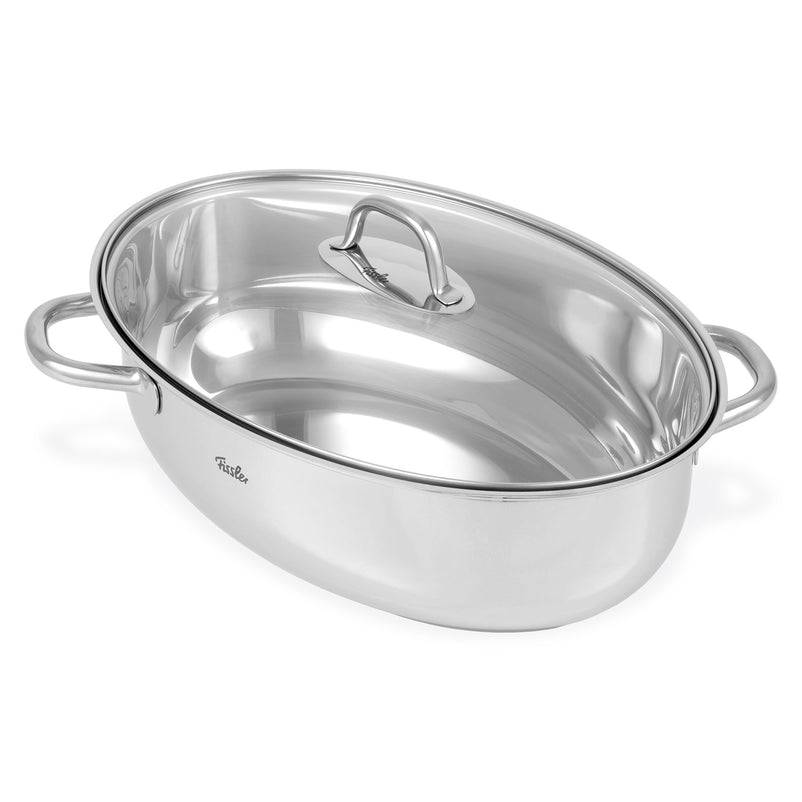 Oală cu capac Roaster. Mânerele metalice reci permit ridicarea și transportul ușor, chiar și în cazul conținutului greu și fierbinte.