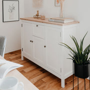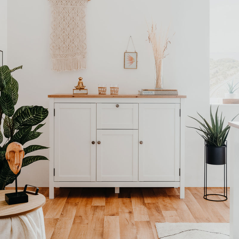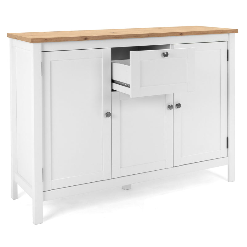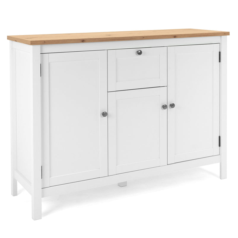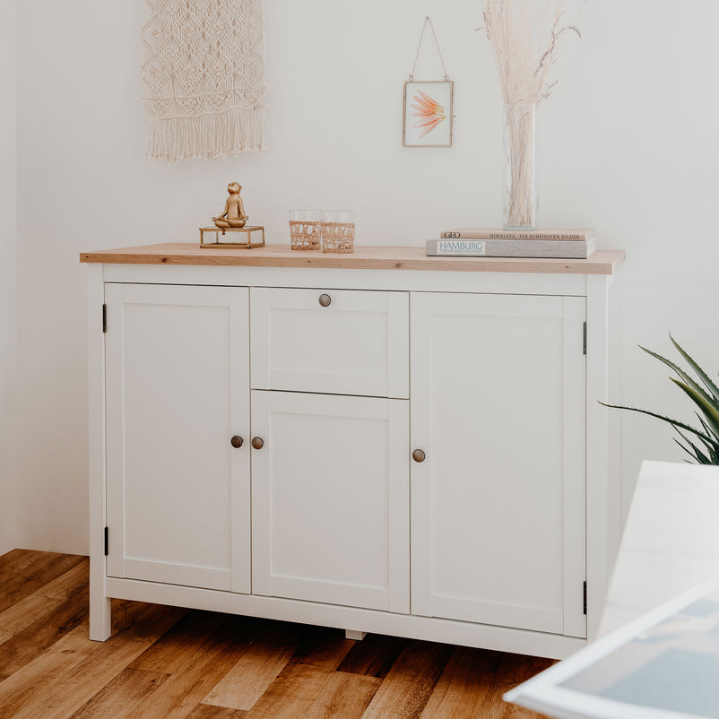 Comodă 3 uși, 1 sertar Varenna. Piesele din gama Varenna sunt o alegere ideală pentru a mobila un dormitor în stil Natural Spirit, transformând spațiul vostru într-un loc îmbietor și plin de armonie. Comoda Varenna este realizată din panouri aglomerate din lemn și MDF, asigurând un plus de spațiu pentru lucrurile voastre, fiind depozitate în mod organizat și mereu la îndemână. Cromatica neutră va contribui la un decor luminos și primitor.