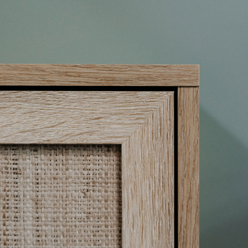Comodă 2 uși Majorca. Piesele din gama Majorca sunt realizate din PAL și imitație ratan pe fronturi. Fronturile sunt realizate din PAL cu acoperire celulozică: un print care imită rătanul.