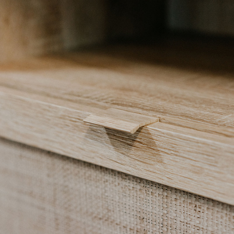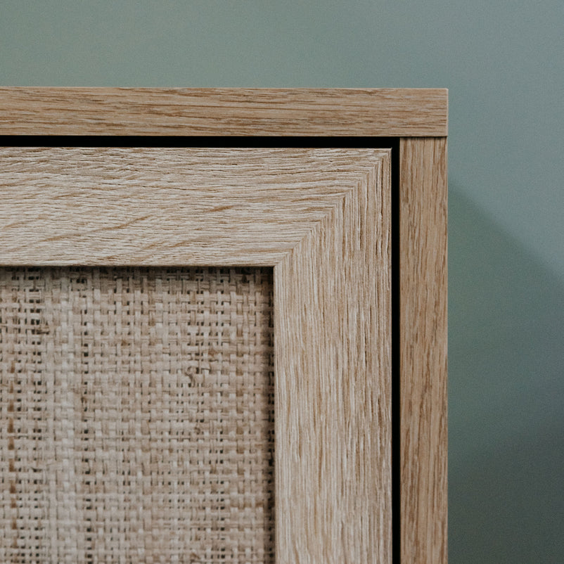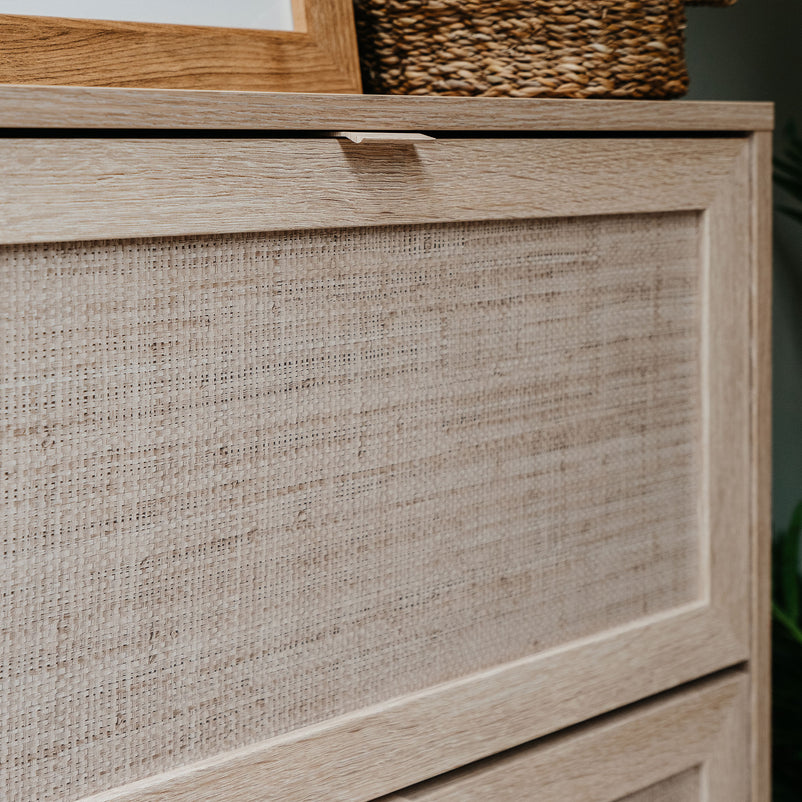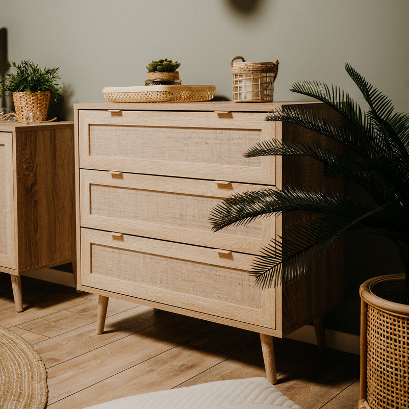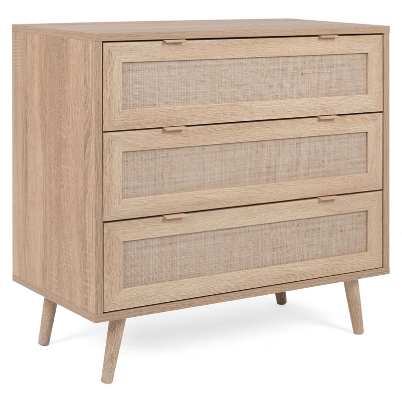 Comodă 3 sertare Majorca. Piesele din gama Majorca sunt realizate din PAL și imitație ratan pe fronturi. Fronturile sunt realizate din PAL cu acoperire celulozică: un print care imită rătanul.