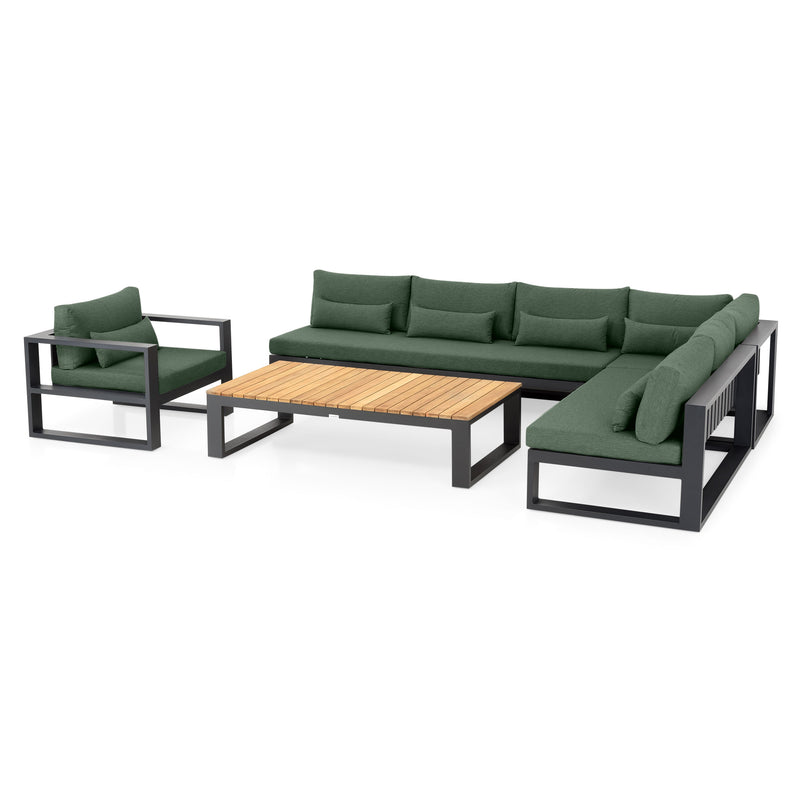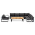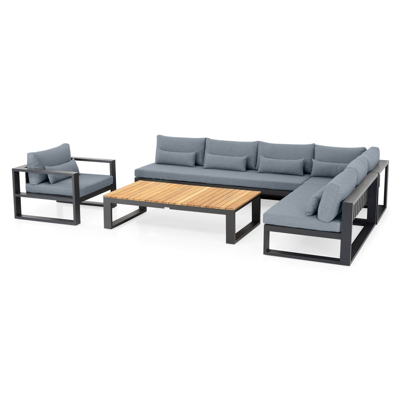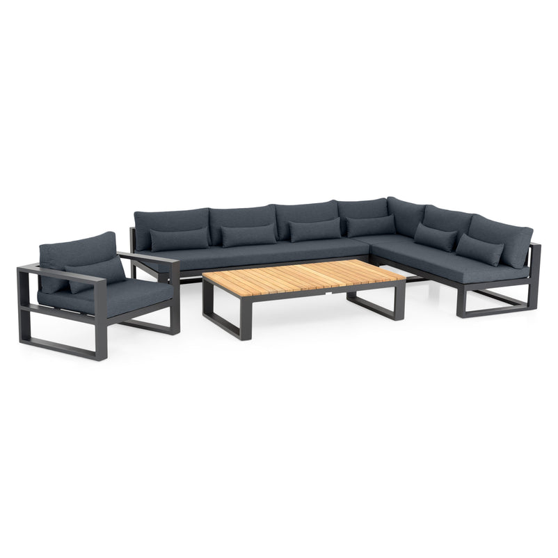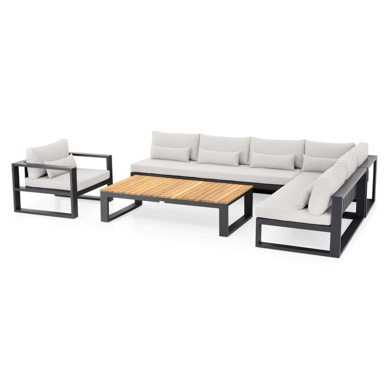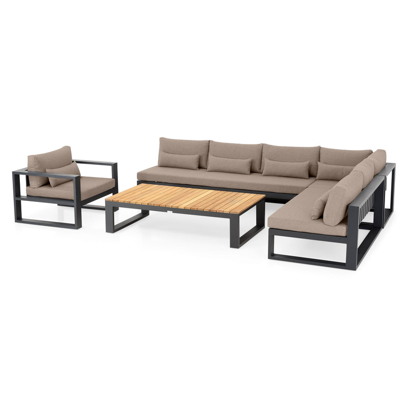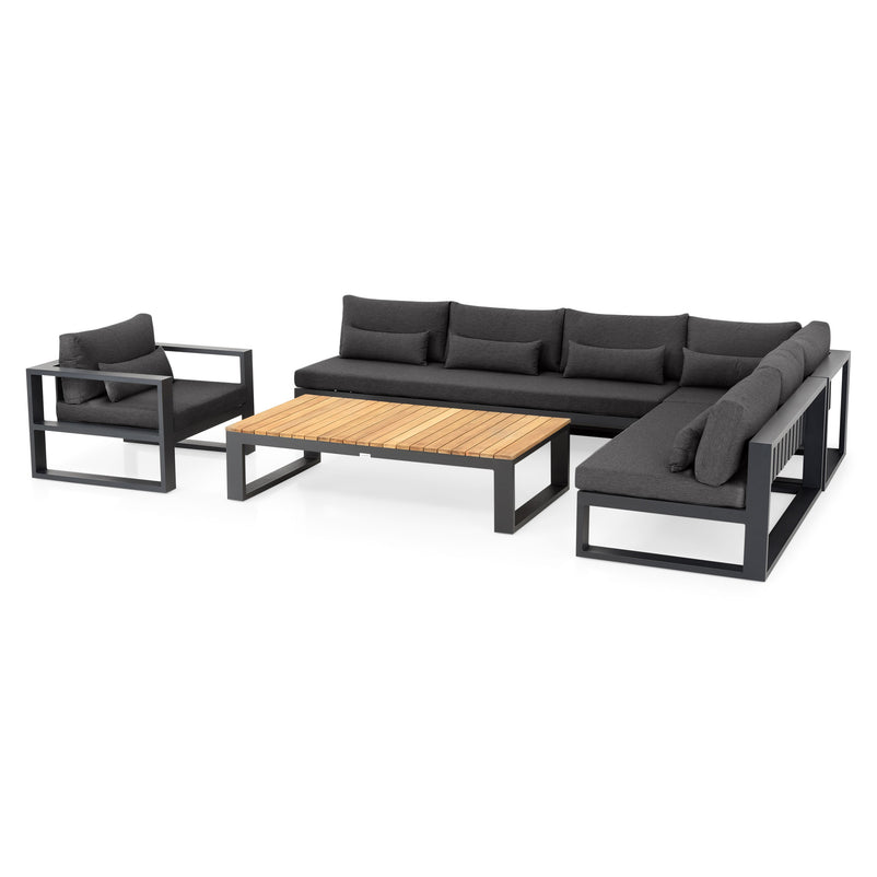Set mobilier terasă/grădină, fotoliu, colțar și măsuță Fermo. Piese speciale pentru mediul exterior, cu un design surprinzător, care să încânte decorativ amenajarea din natură. Bucurați-vă de mese delicioase, savurate în natură, alături de toți cei dragi, la o masă foarte încăpătoare sau de momente de relaxare bând băuturile răcoritoare care să vă dea un plus de energie. Gândit special pentru familiile mari sau pentru persoanele cu mulți prieteni, setul poate găzdui numeroase persoane, gata să petreacă timp de calitate și relaxare în aer liber. Piesele au un design modern, plăcut, în tonuri de negru și gri.