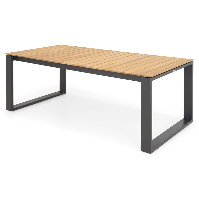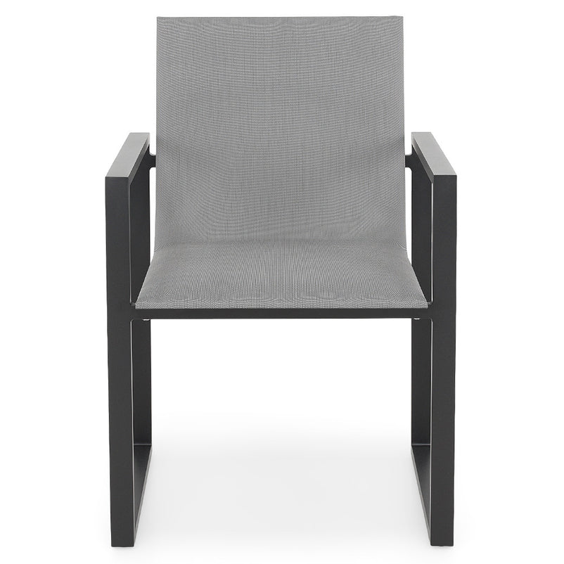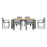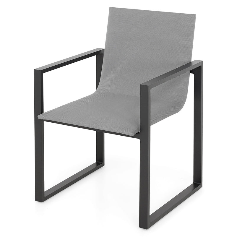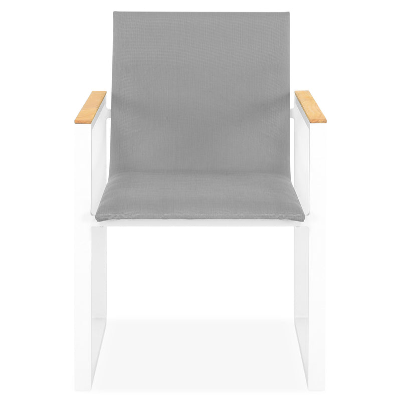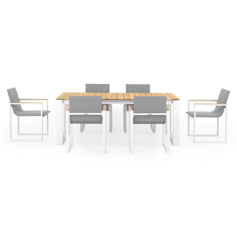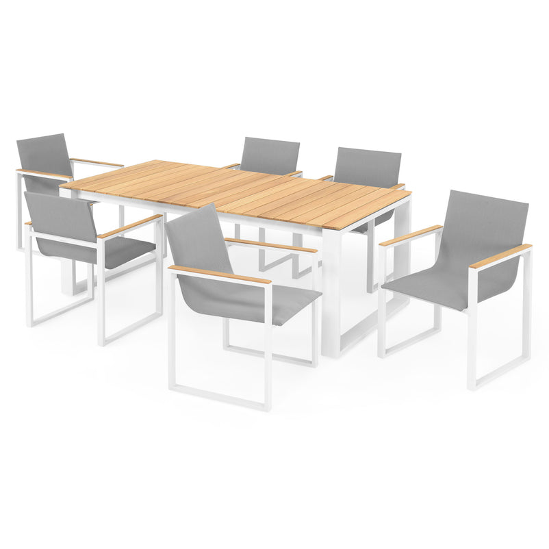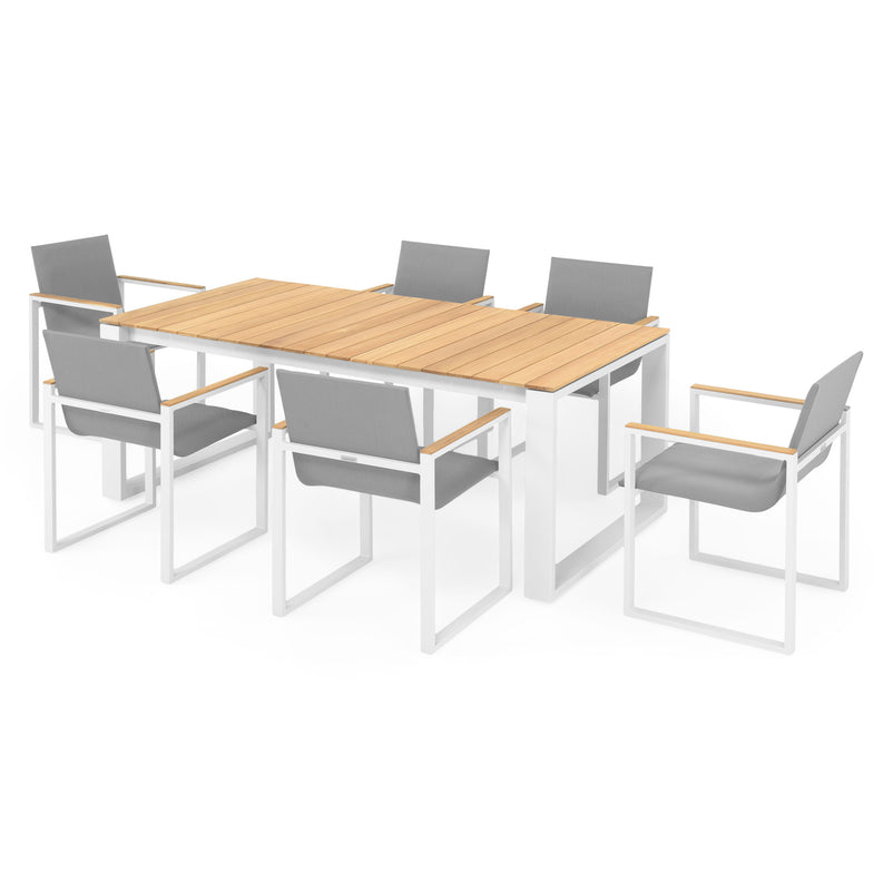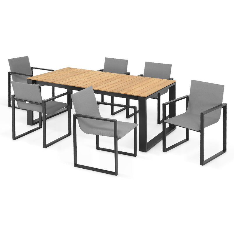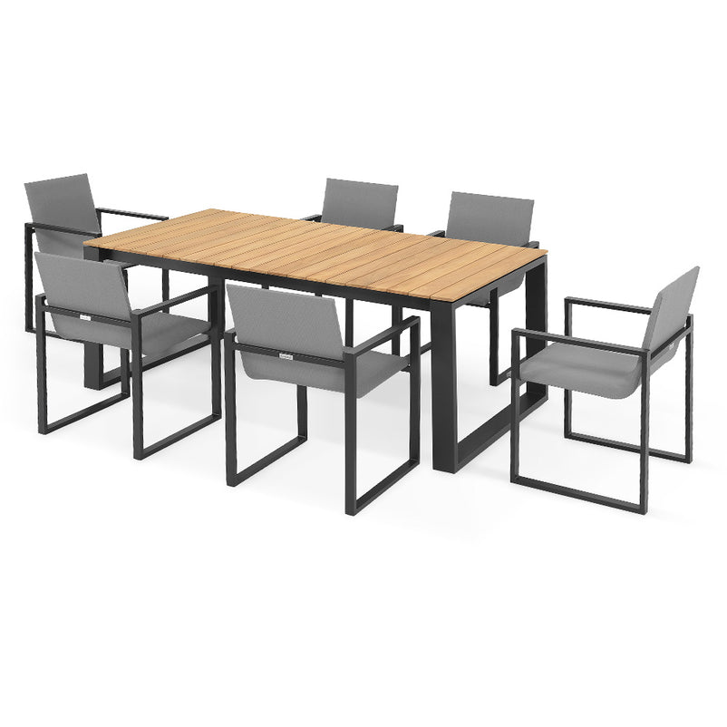 Set mobilier terasă/grădină, 6 scaune și masă Fermo. Creați un spațiu elegant și reconfortant pe terasa sau în grădina voastră pentru a vă bucura de experiența relaxării în aer liber pe durata sezonului cald. Piesele setului pentru exterior din gama Fermo sunt realizate din structură din aluminiu vopsită în câmp electrostatic, iar șezutul și spătarul scaunelor sunt îmbrăcate în textilină dublă și vată pentru un plus de confort. Designul este completat de inserțiile de lemn teak de pe brațele scaunelor. Topul mesei este, de asemenea, realizat din lemn teak.