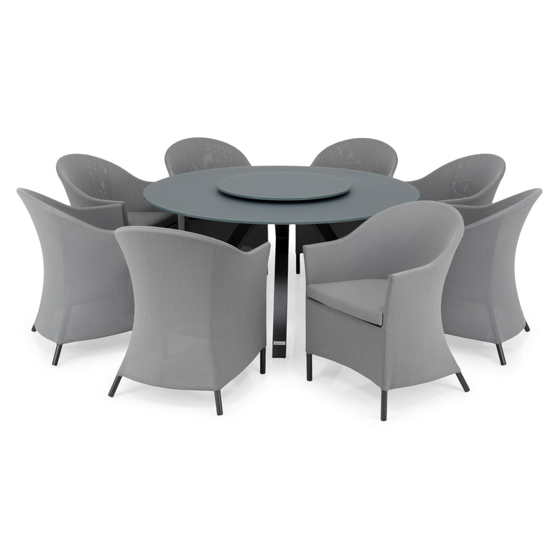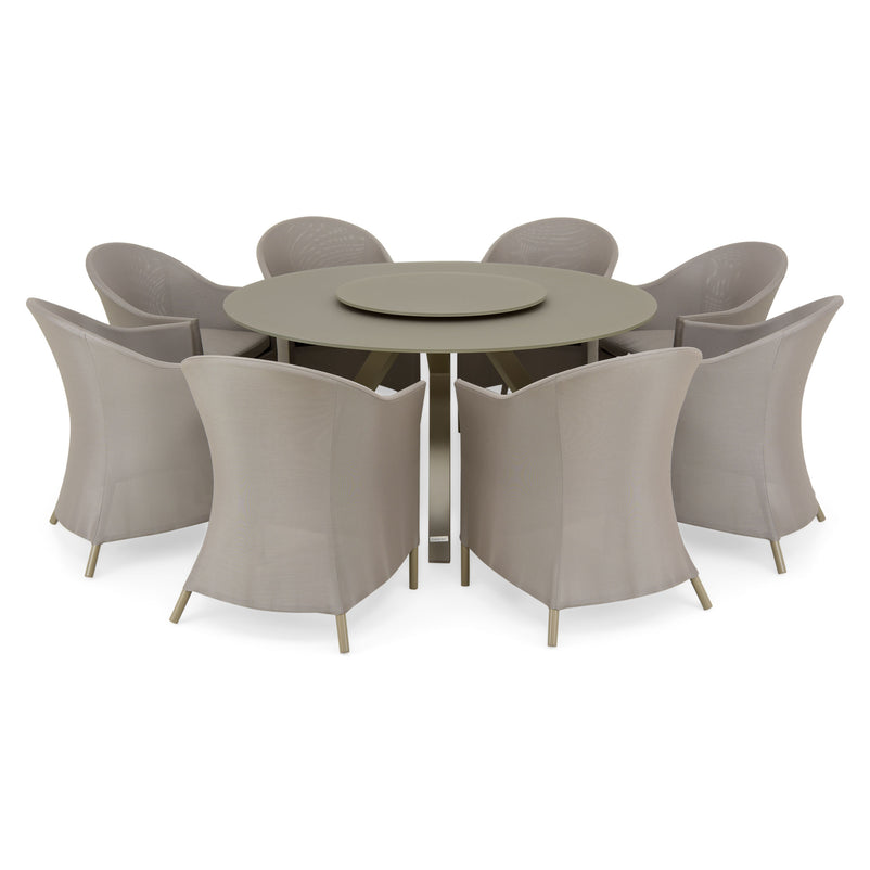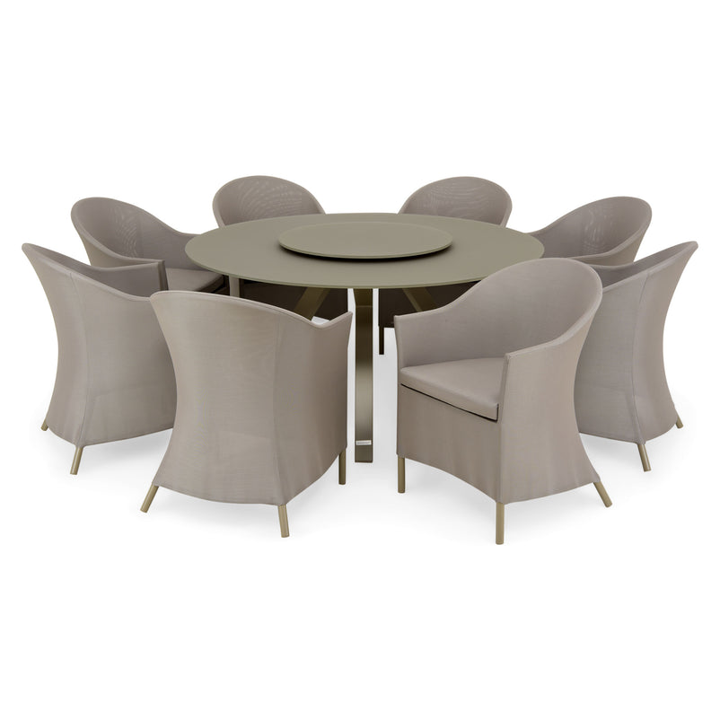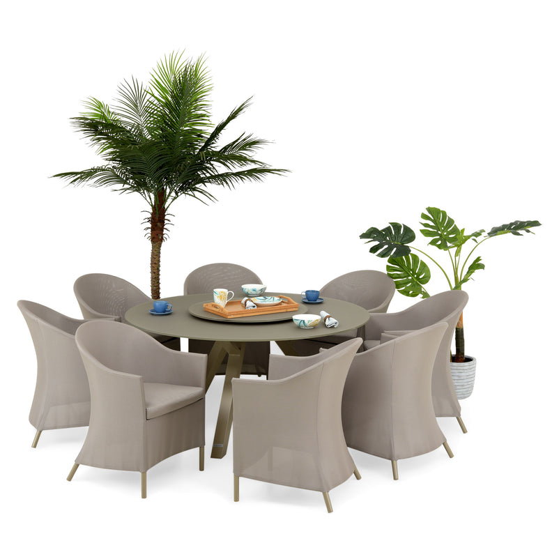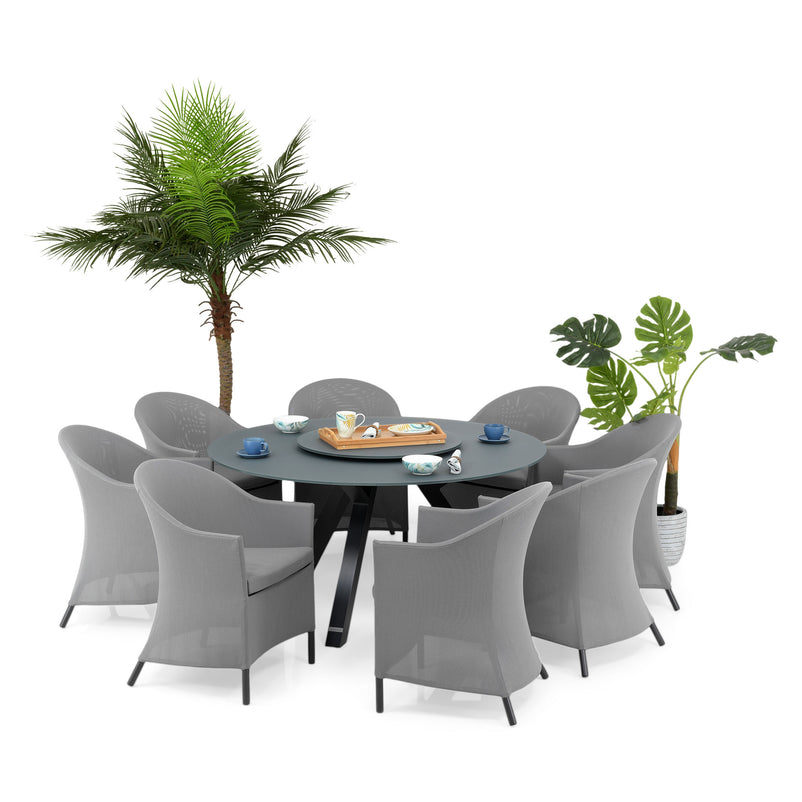 Set mobilier terasă/grădină, 8 scaune și masă Doris/Sedona. Când se adună lumea bună, toate lucrurile merg ca pe roate oriunde v-ați afla. Setul de mobilier format din 8 scaune și o masă din gama Doris/Sedona este util atunci când sărbătoriți alături de prieteni, astfel încât să vă adunați și să petreceți împreună. Realizată din structură de aluminiu vopsită în câmp electrostatic, iar scaunele îmbrăcate cu textilină fină cu protecție UV, puteți sta confortabil fără probleme timp îndelungat. Include perna din țesătură Dralon cu protecție împotriva umezelii și a decolorării, iar diametrul suportului rotativ este de 73 cm. Dați startul pregătirilor de primăvară cu acest set pentru terasă și grădină și veți obține decorul mult visat acasă la voi.