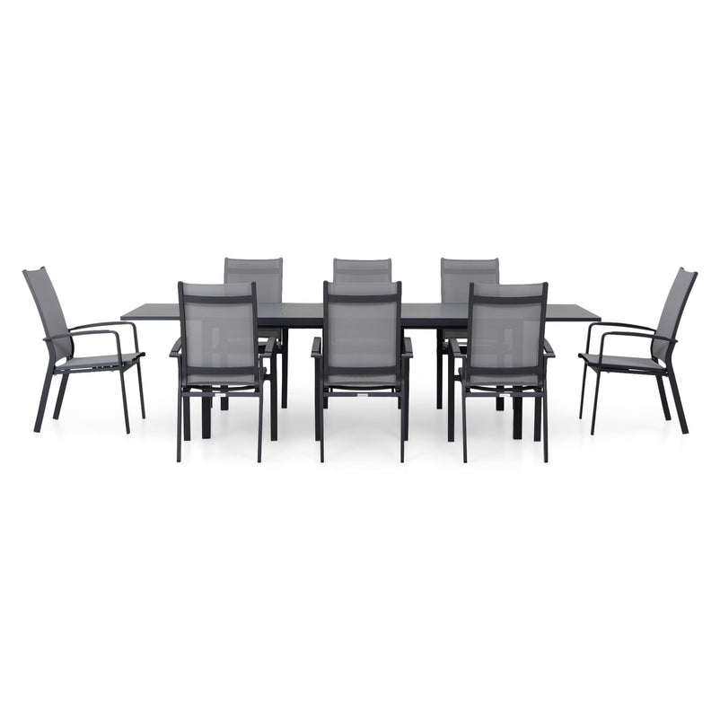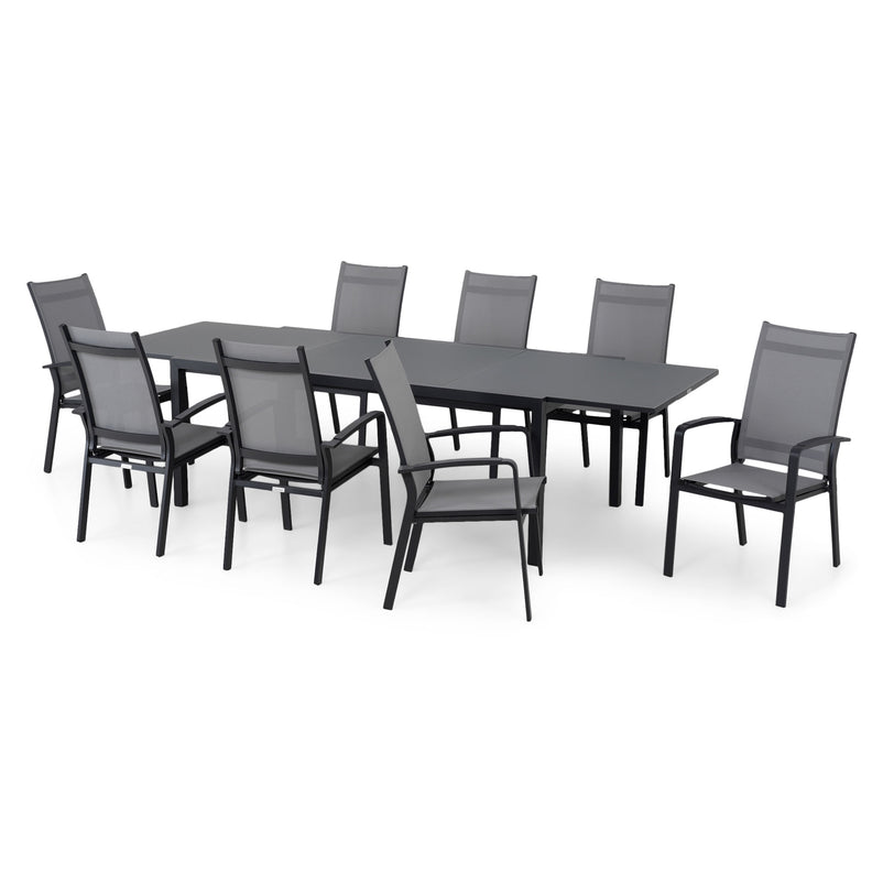 Set mobilier terasă/grădină, 8 scaune cu spătar reglabil și masă extensibilă Cosmo. Setul din gama Cosmo este perfect pentru servirea mesei în aer liber. Piesele de mobilier componente au un design simplu și funcțional, oferindu-vă confortul de care aveți nevoie pentru a vă amenaja eficient grădina sau terasa. Scaunele sunt din structură solidă de aluminiu vopsită în câmp electrostatic. Șezutul și spătarul scaunelor sunt îmbrăcate cu textilină fină cu protecție UV. Topul mesei este realizat din sticlă securizată 4mm, finisaj mat. Scaunele sunt suprapozabile.