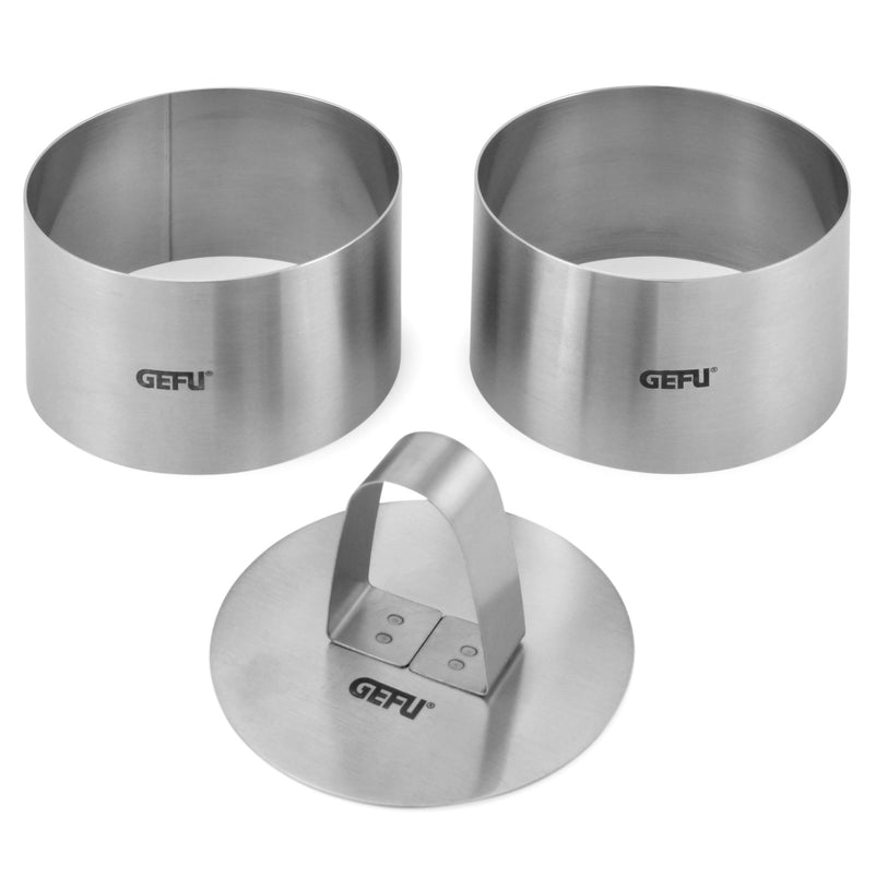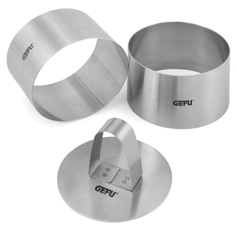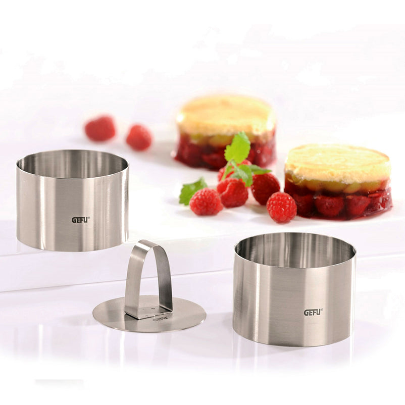 Set 2 forme, inox Forma. Aceste inele pentru aperitive și deserturi fac ca preparatele să arate atrăgător și apetisant. Cu un diametru de 7.5 cm și o înălțime de 5 cm, ele formează aperitive, feluri principale și deserturi în prezentări atrăgătoare. Se completează perfect cu setul profesional de inele pentru farfurii.