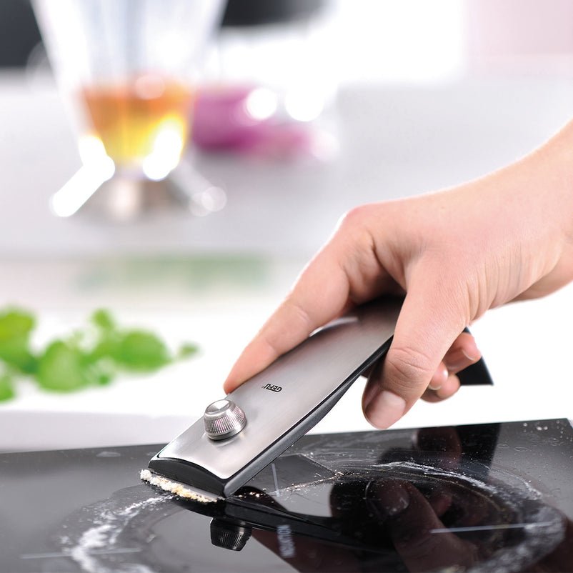 Curățător pentru plită Blanko. Curățătorul Blanko este piesa perfectă pentru plite curățate eficient și cu grijă. Unghiul acestuia poate fi setat pentru o curățare ușoară, iar mecanismul de alunecare protejează lama. Curățătorul pentru plită Blanko este realizat din inox și plastic.