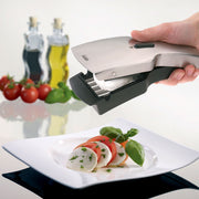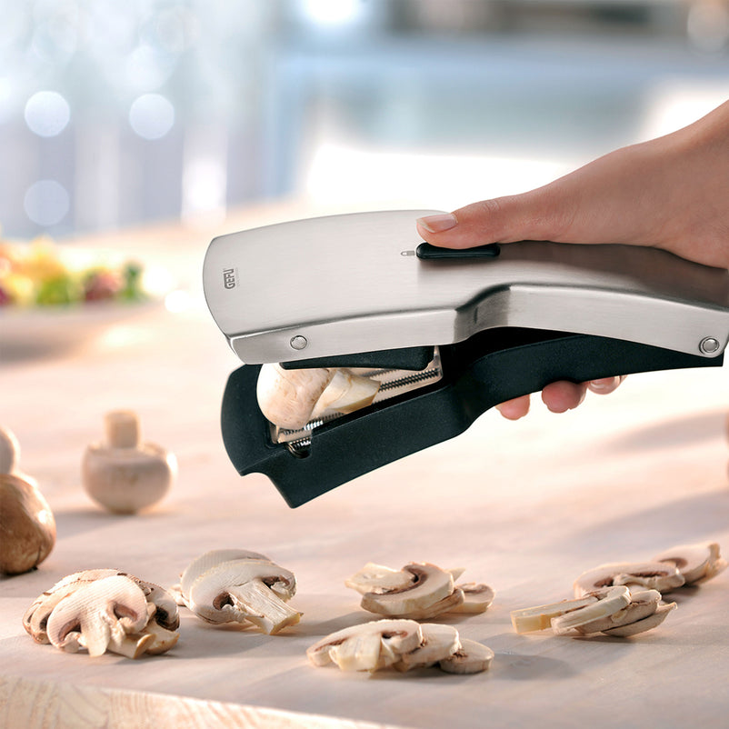 Feliator manual legume, fructe, brânzeturi Tari.Lamele japoneze speciale, rezistente, din oțel inoxidabil, permit tăierea exactă a felii de 5 mm, având 560 de dinți extrem de ascuțiți. Acestea sunt ideale pentru tăierea fructelor, legumelor, ouălor, cârnaților de porc și brânzei. Designul său permite o curățare ușoară datorită barelor care se pot plia.