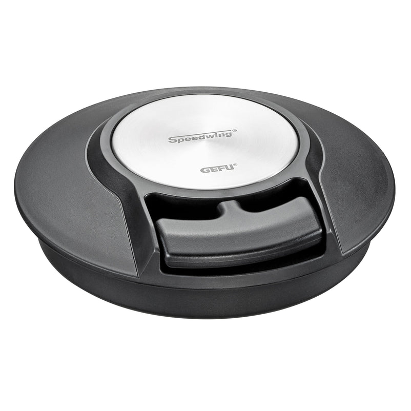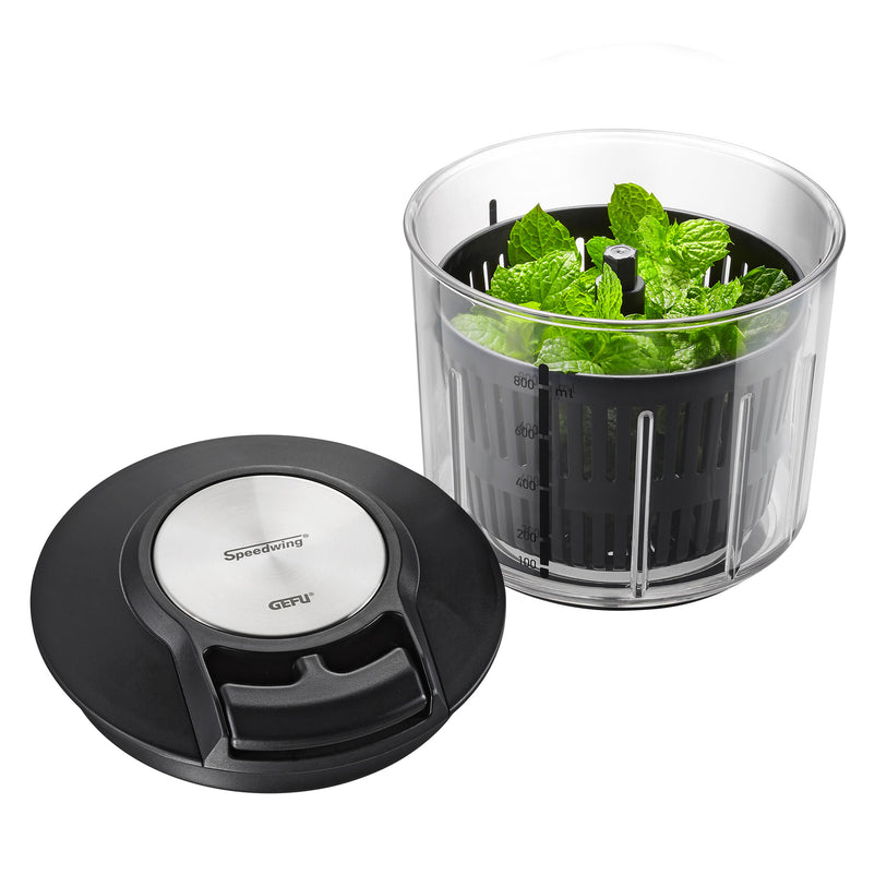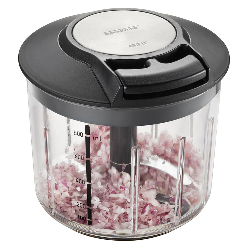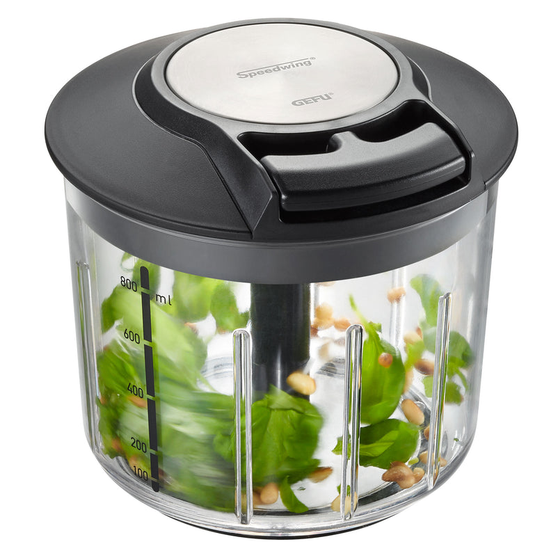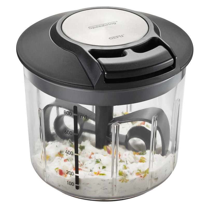 Dispozitiv pentru tocat Speedwing. Fără a utiliza electricitate și având o gamă extrem de largă de utilizări, acest produs versatil nu doar că taie fructe, legume, nuci, ceapă și pește, dar poate fi folosit și pentru amestecarea și mixarea dipurilor, prepararea deserturilor și uscarea ierburilor.