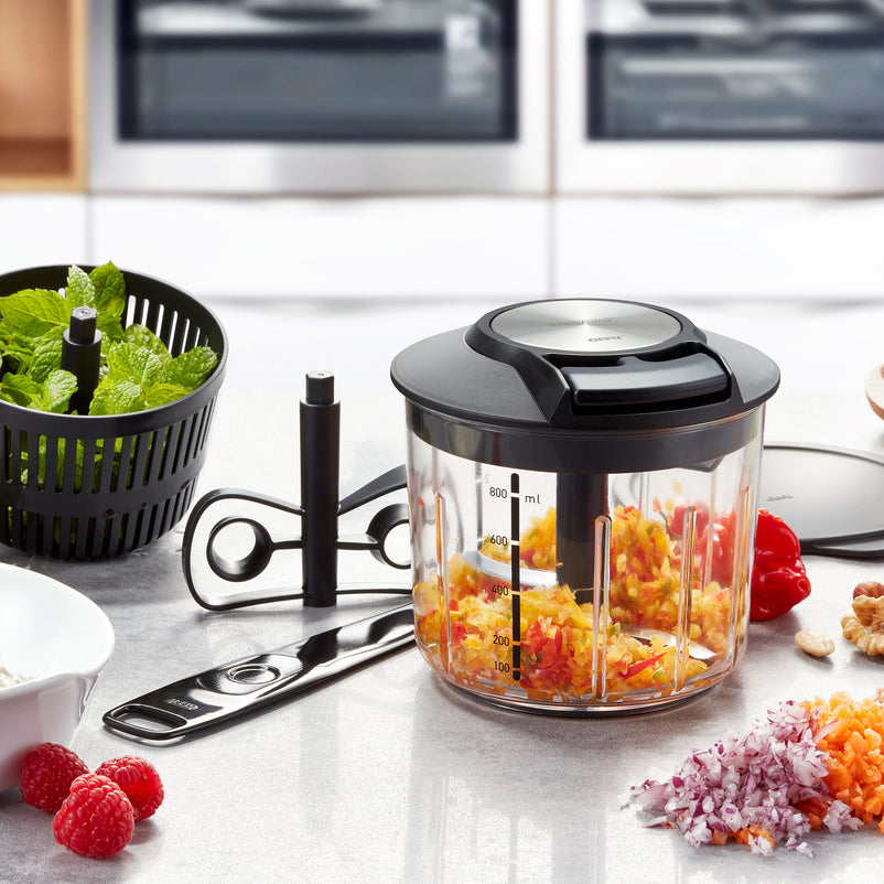 Acest aparat este un multi-talent eficient care face din zdrobirea, mărunțirea, amestecarea, bătutul și mixarea ingredientelor o joacă de copii. În funcție de timpul de utilizare, inserția de tăiere poate transforma morcovii, nucile și altele într-o consistență de la grosieră la foarte fină, iar lamele foarte ascuțite asigură rezultate perfecte. Un alt insert este ideal pentru prepararea pastelor cremoase și dressingurilor pentru salate, după ce ierburile au fost uscate în coșul de centrifugare. Grosele din recipient ghidează mereu mâncarea tăiată către bază, iar scalarea practică ajută la măsurarea ingredientelor. Containerul transparent din material SAN rezistent, prevăzut cu un inel de bază, permite dispozitivului să stea în siguranță în orice moment.