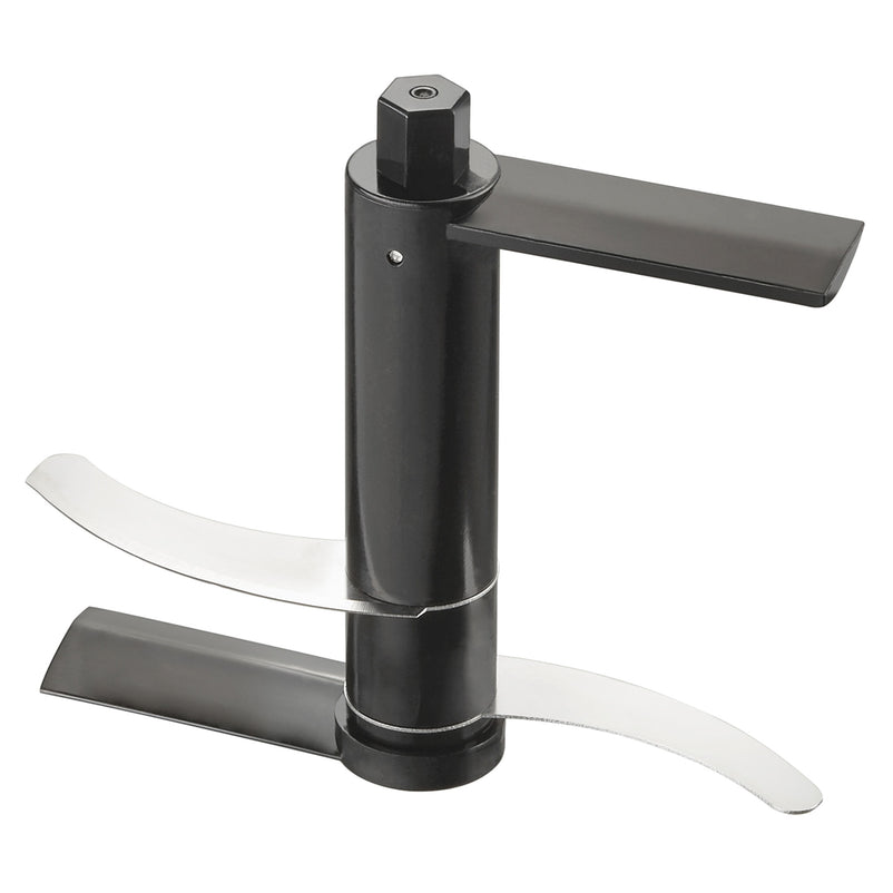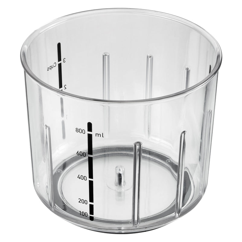 Vine cu capac de depozitare și spatulă, iar inserțiile sunt ușor de înlocuit. Baza cu inel anti-alunecare garantează o fixare sigură, iar capacele de protecție pentru lame sunt incluse pentru siguranță. Scală de măsurare în ml, căni și fl. oz ajută la dozarea ingredientelor, iar volumul de umplere este de 800 ml. Toate componentele, cu excepția capacului cu mecanismul de sfoară, sunt compatibile cu mașina de spălat vase.
