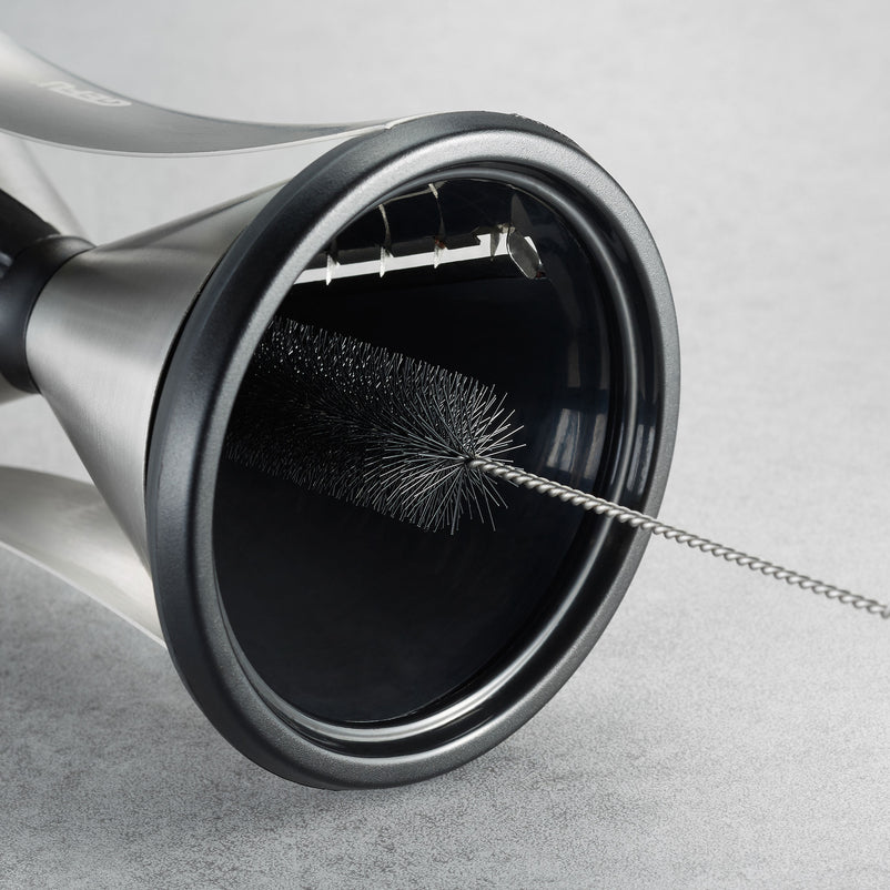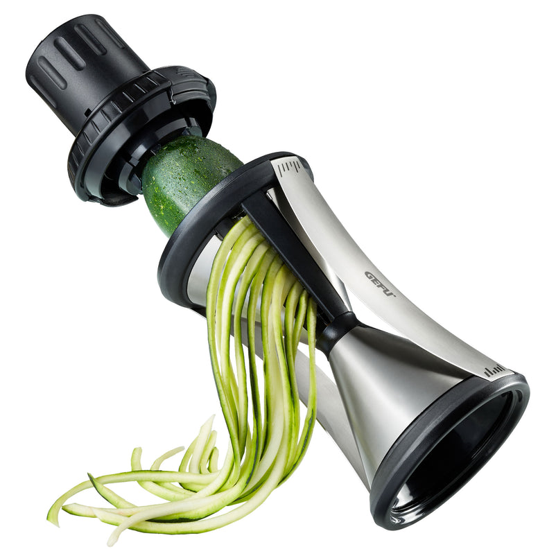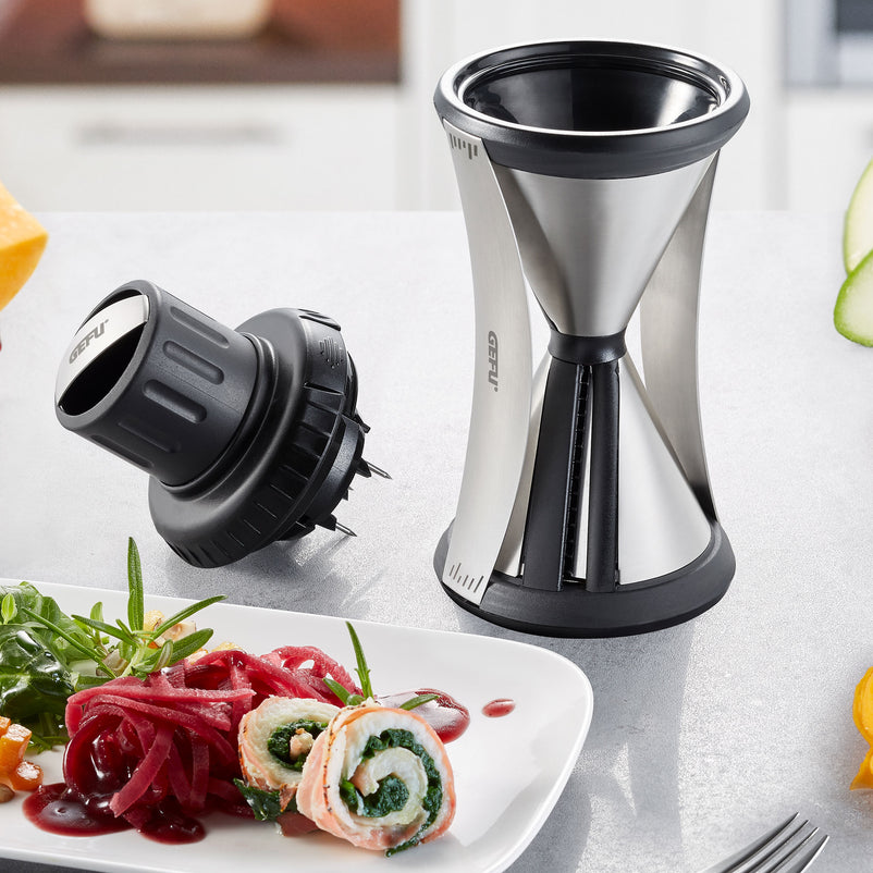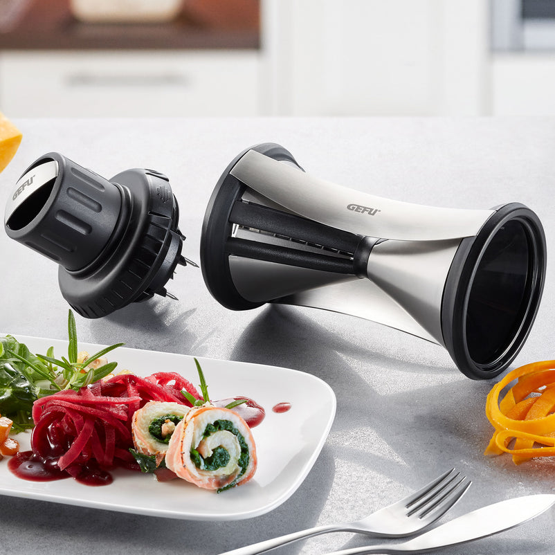 Feliator spiralat Spirelli. Designul elegant și materialele de înaltă calitate se îmbină perfect cu funcționalitatea în SPIRELLI® XL, feliatorul spiral care transformă chiar și legumele mai groase, precum ridichile, sfecla roșie, cartofii sau dovleceii, în spirale julienne largi și apetisante. Cu două opțiuni de lățime pentru spirale (4,5 mm și 8 mm), acest dispozitiv poate procesa legume cu un diametru de până la 6,5 cm. Suportul atașabil pentru legume, echipat cu trei pini din oțel inoxidabil, asigură o prindere sigură și o utilizare eficientă a legumelor, reducând risipa. Pentru un plus de comoditate, SPIRELLI® XL include o perie de curățare, facilitând întreținerea rapidă după utilizare. Lamele sale sunt realizate din oțel japonez de înaltă calitate, garantând precizie și durabilitate. Un accesoriu ideal pentru iubitorii de preparate sănătoase și aspectuoase!